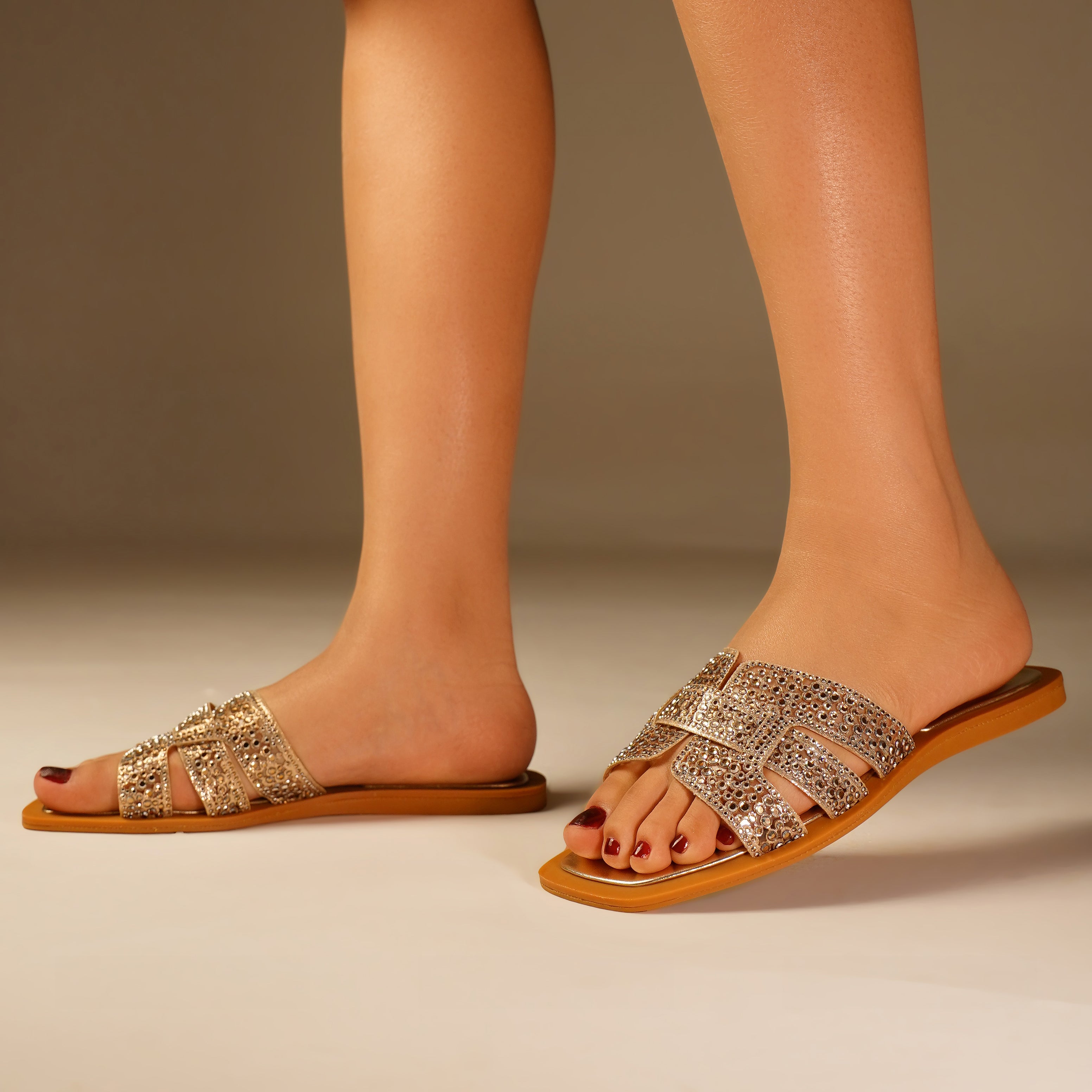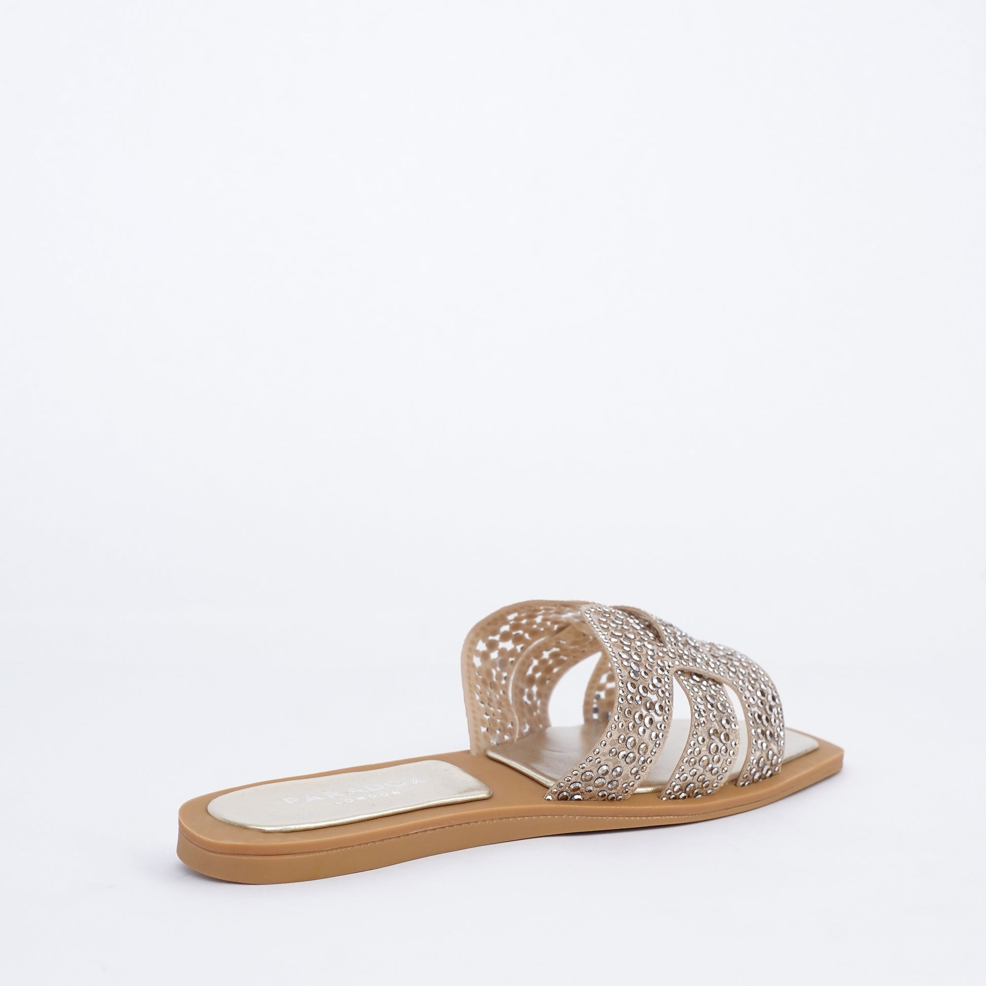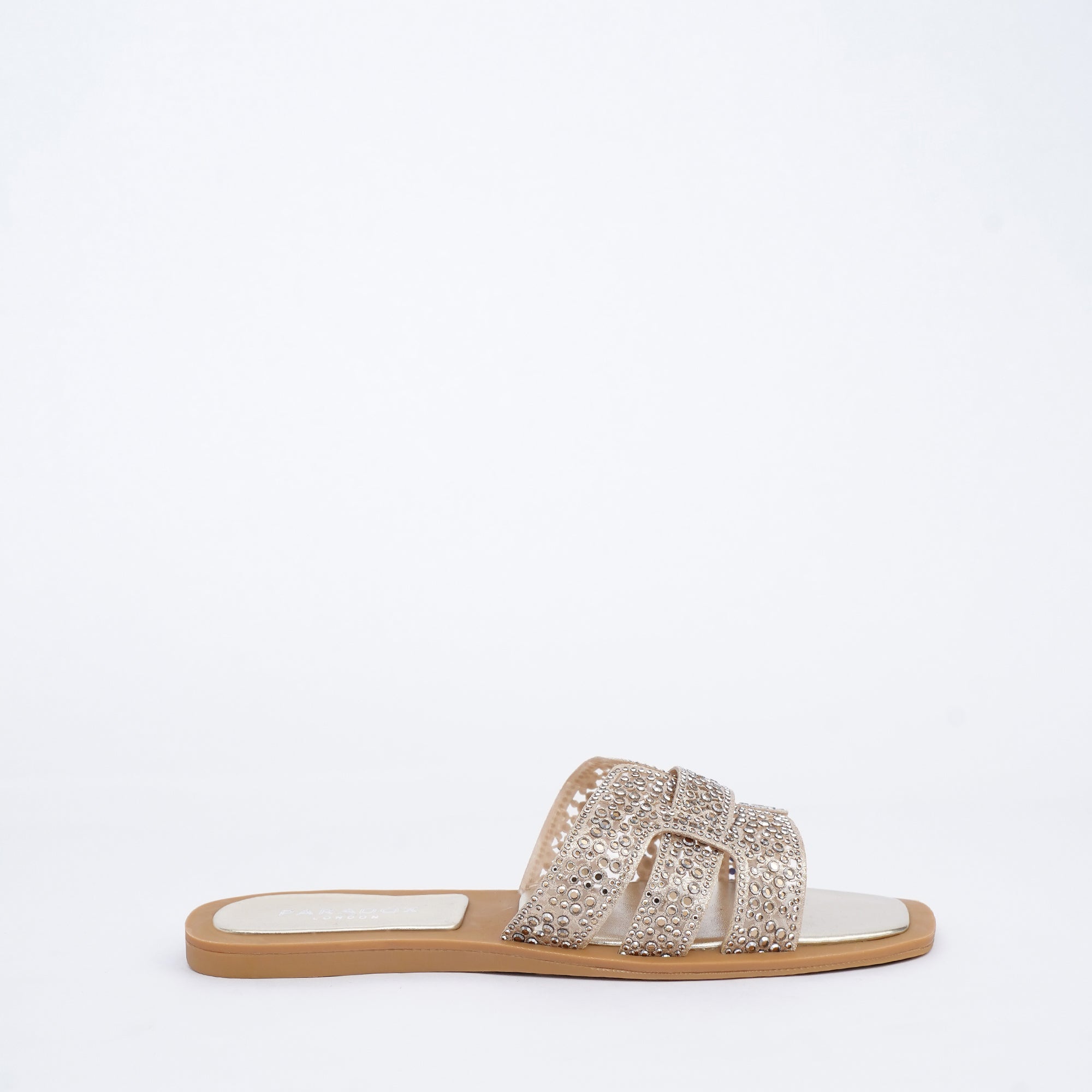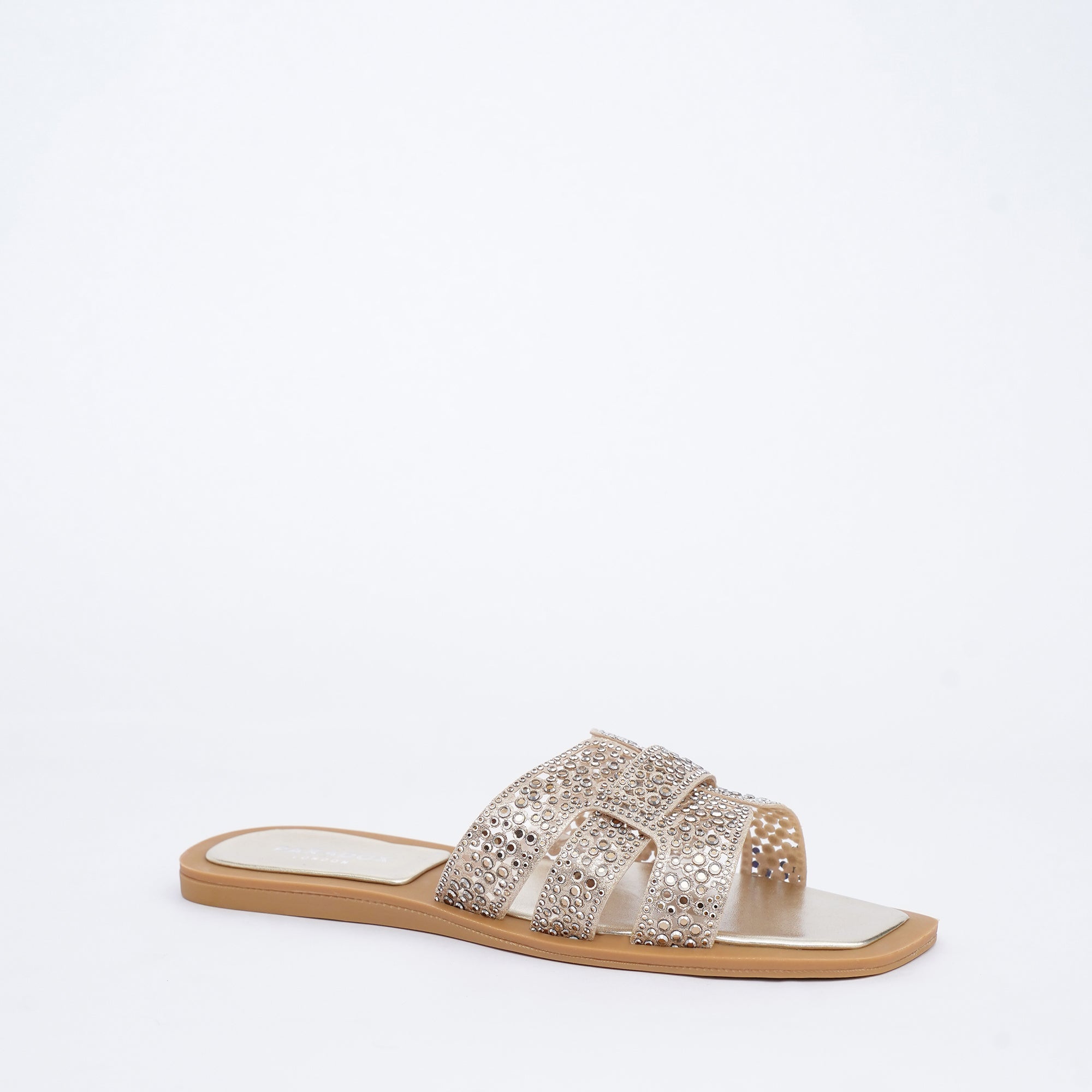 The Bali slide in champagne delivers glamour and comfort. It features an intricate criss cross upper crafted from Champagne PU lining. The entire strap is covered in a dense layer of gold toned diamanté crystals, creating a high-wattage, cohesive sparkle. This flat offers statement texture and monochromatic shine.