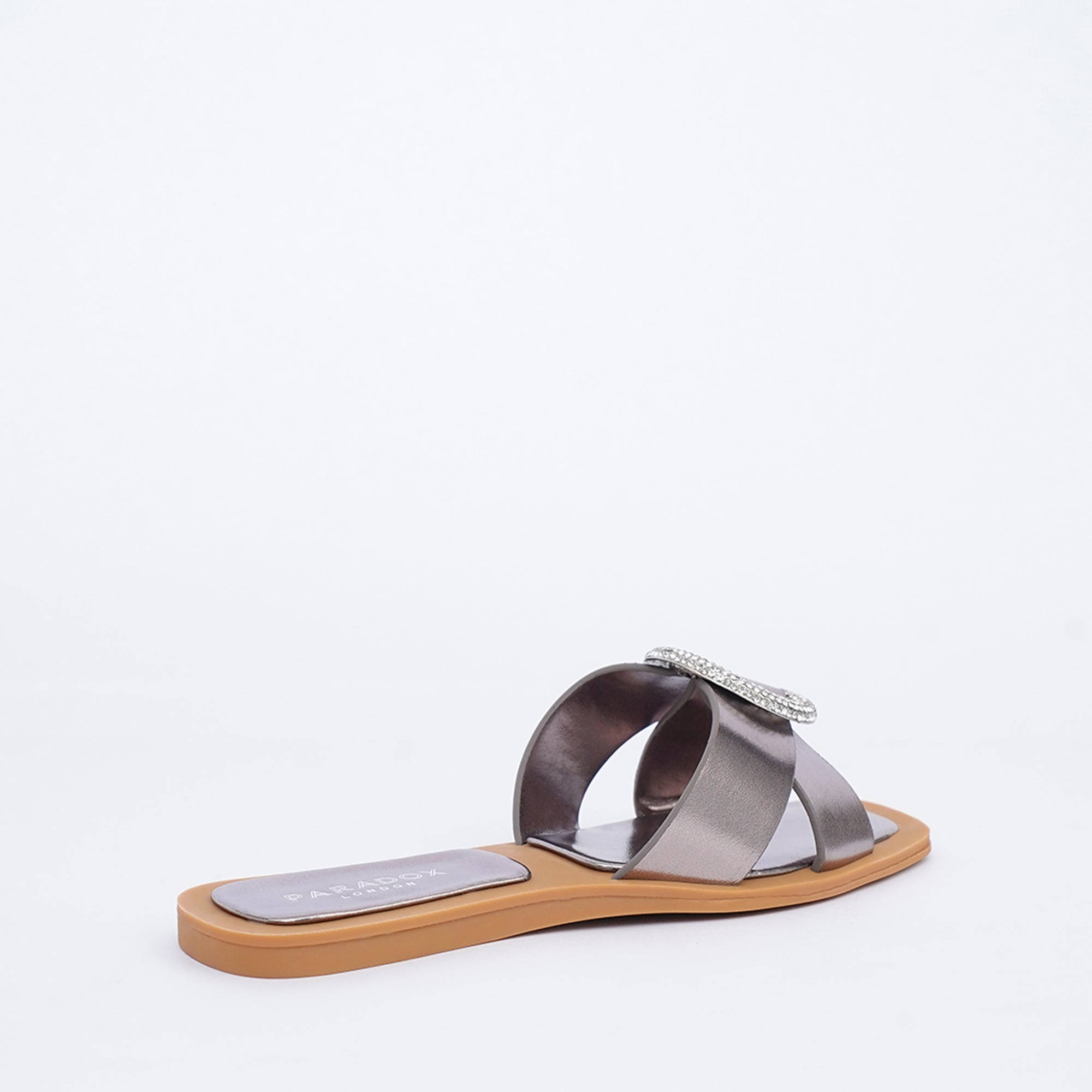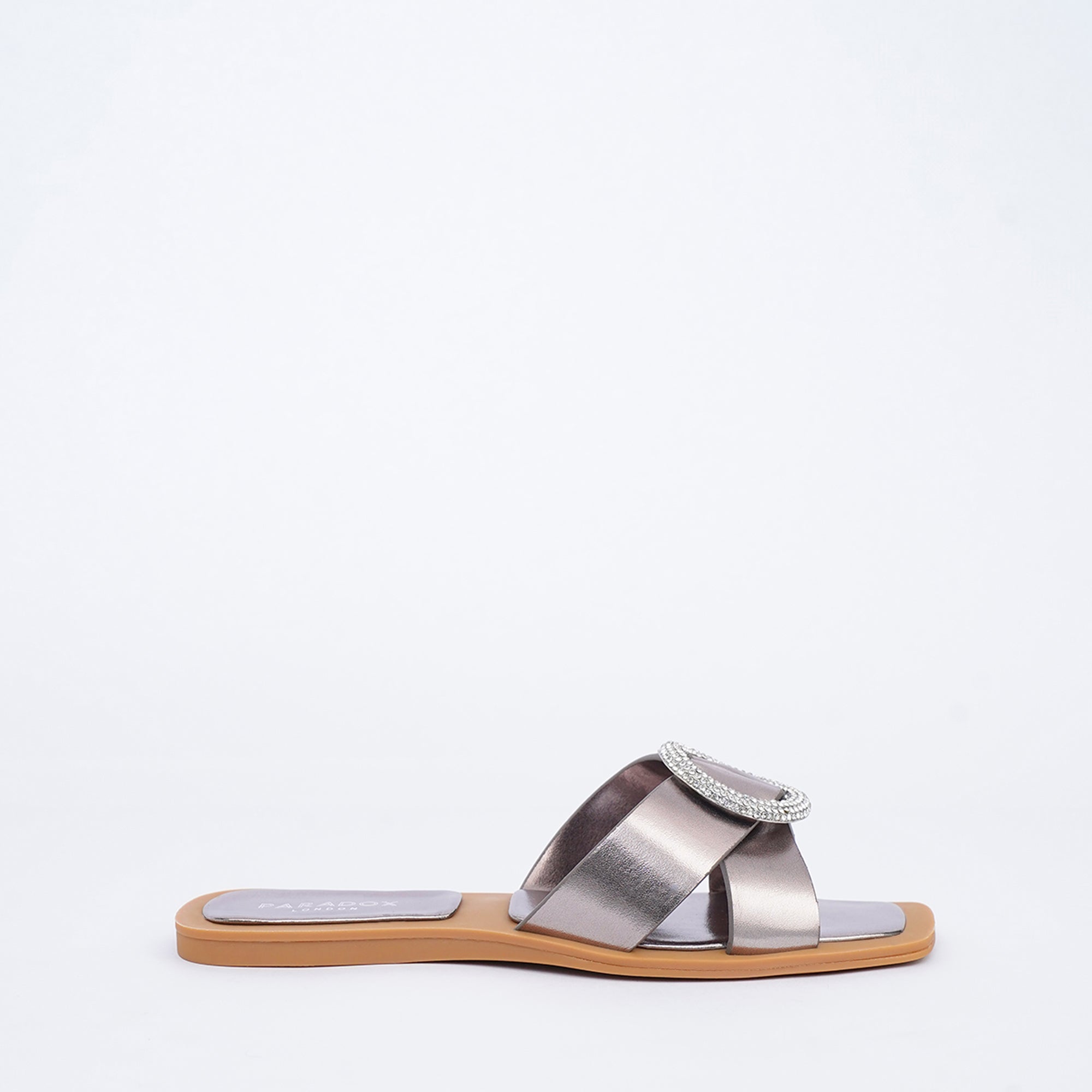 The Barcelona slide delivers eye catching sparkle and structure. It features a wide, perforated upper crafted in a sleek Pewter metallic shade. The entire strap is densely covered in silver-toned diamanté crystals, creating a high wattage, sophisticated shimmer that perfectly highlights the cut out design.