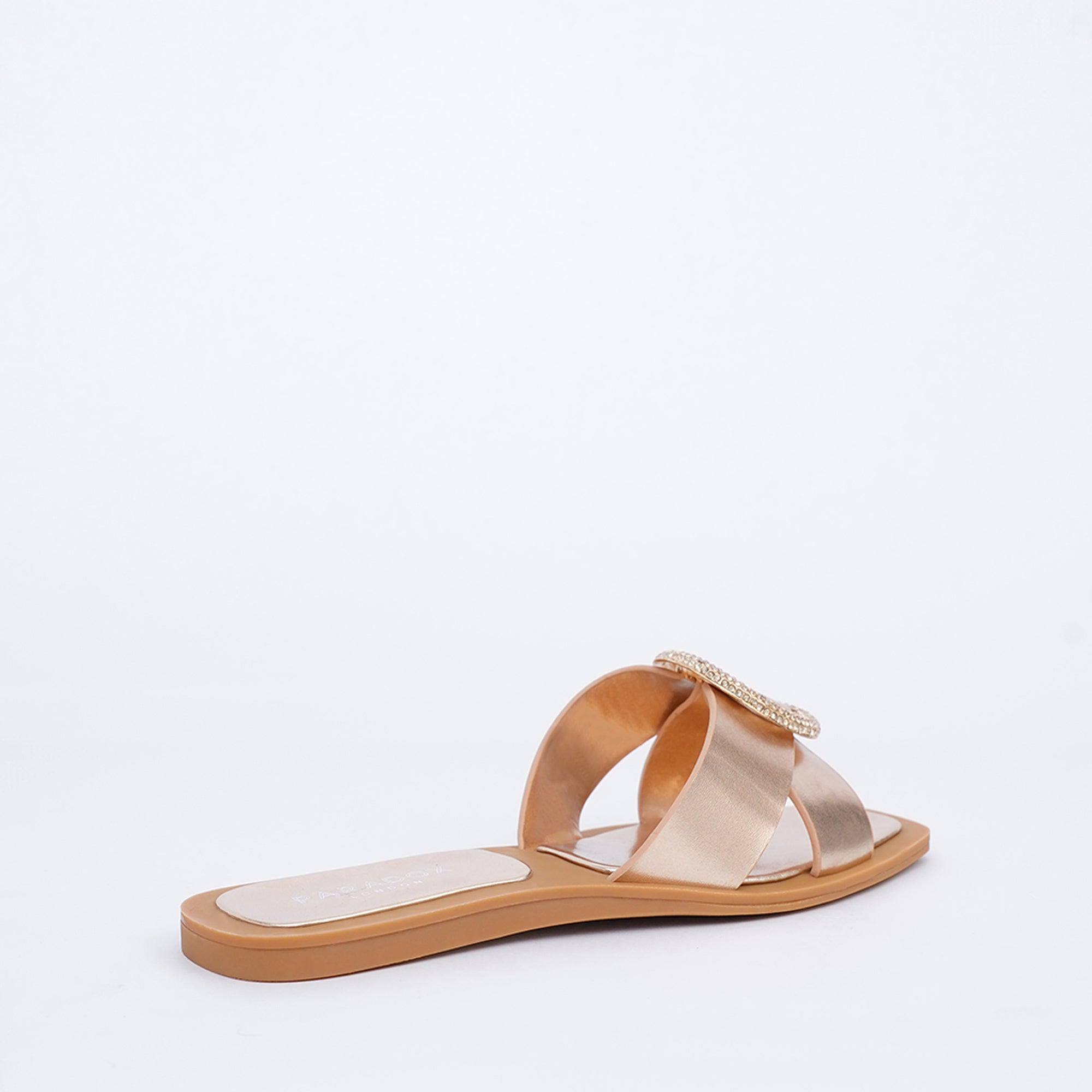 The Barcelona slide in rose gold delivers eye catching sparkle and structure. It features a wide, perforated upper crafted in a sleek Rose Gold metallic shade. The entire strap is densely covered in rose gold toned diamanté crystals, creating a high wattage, sophisticated shimmer that perfectly highlights the cut out design.