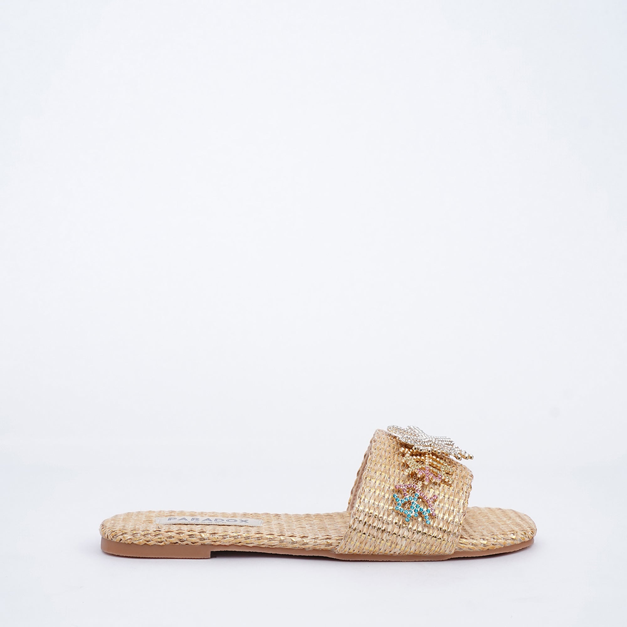 The Beach slide in gold delivers vacation ready glamour. It features a broad, textural upper crafted from woven raffia in a beautiful Gold shade. The silhouette is defined by a large, intricate diamanté starburst embellishment, adding a dramatic, high-wattage sparkle that contrasts beautifully with the woven texture.