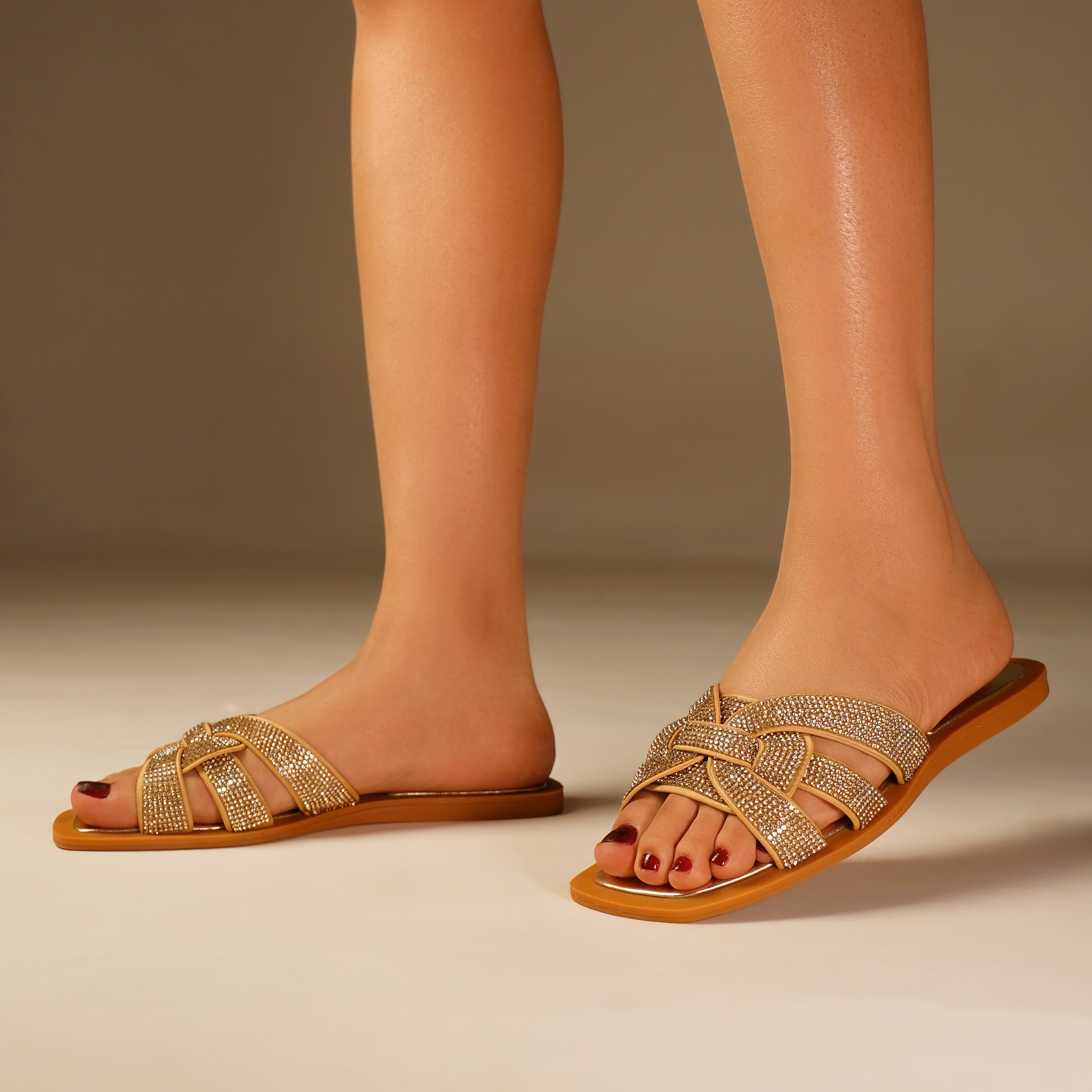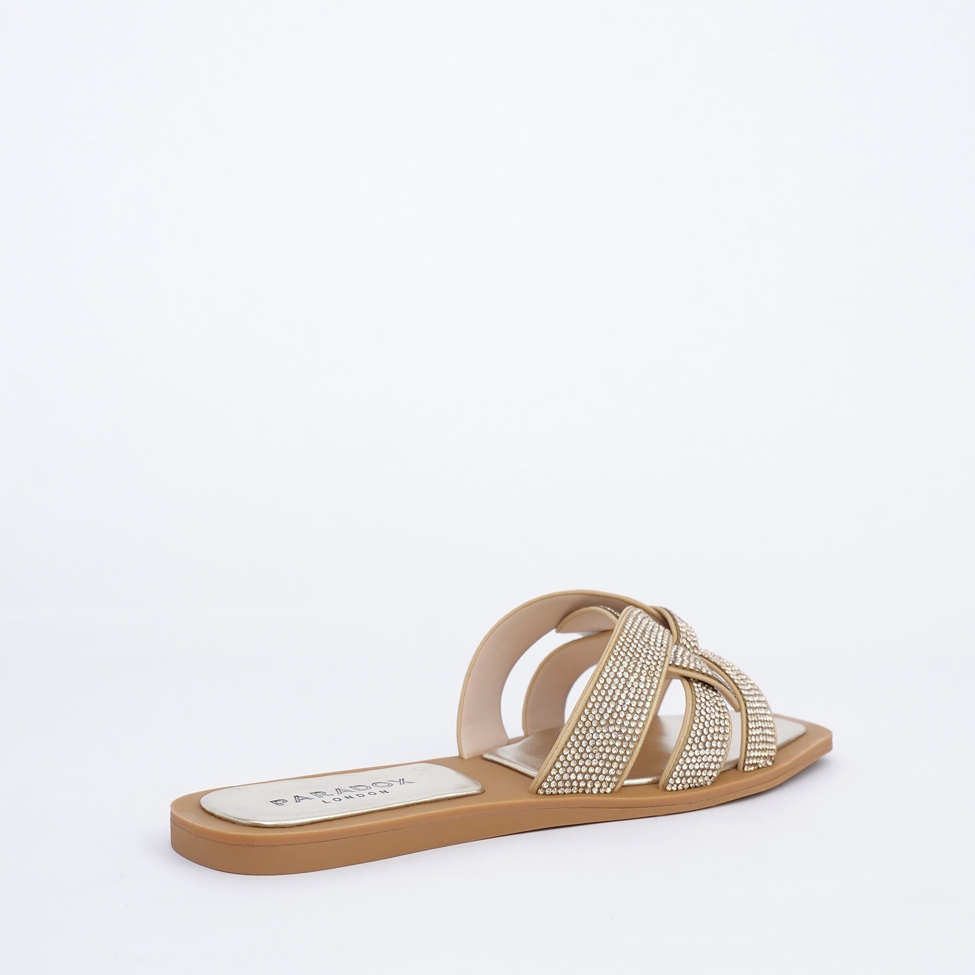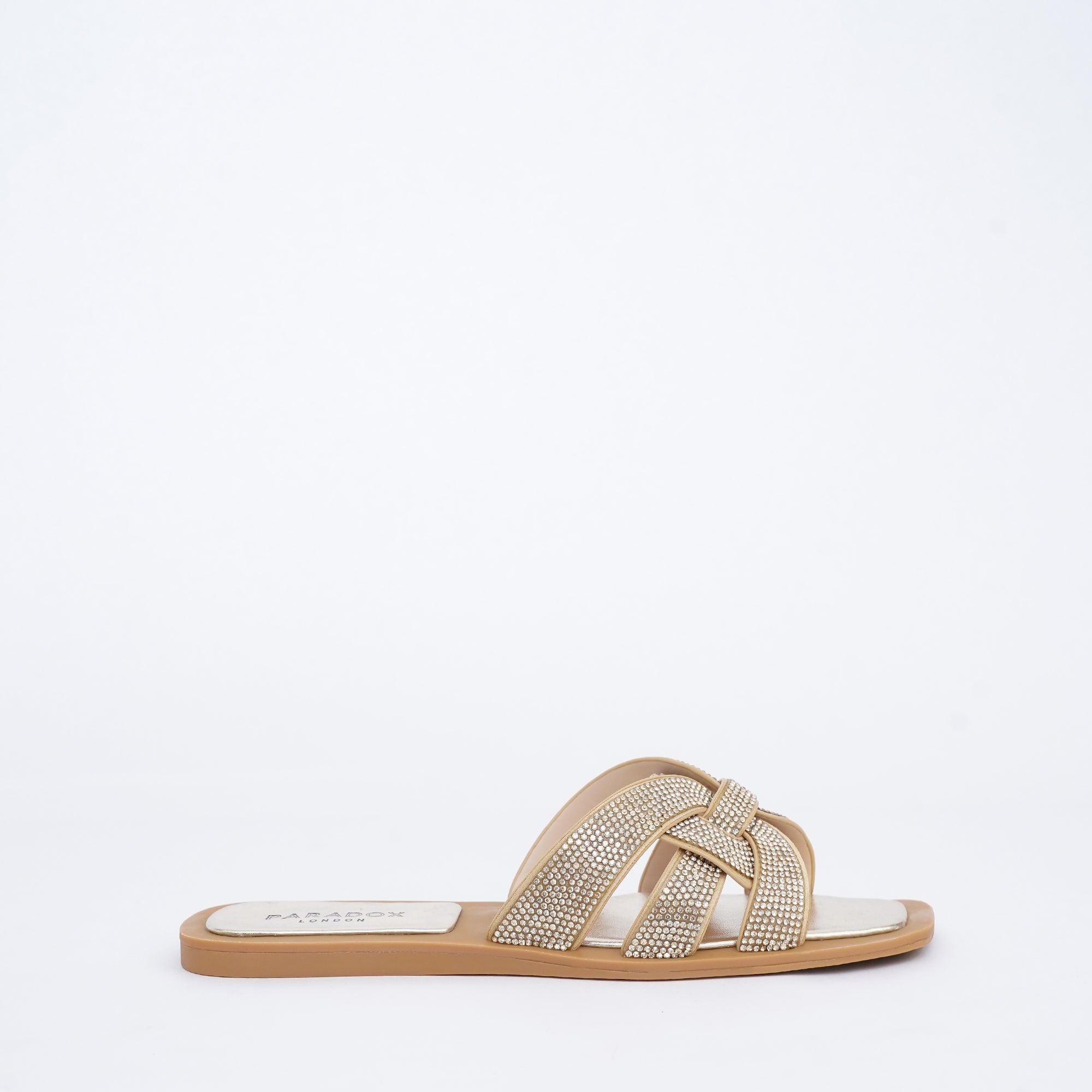 The Belize slide delivers glamour and comfort. It features an intricate criss cross upper crafted from Champagne PU lining. The entire strap is covered in a dense layer of champagne toned diamanté crystals, creating a cohesive sparkle. This flat offers statement texture and shine.