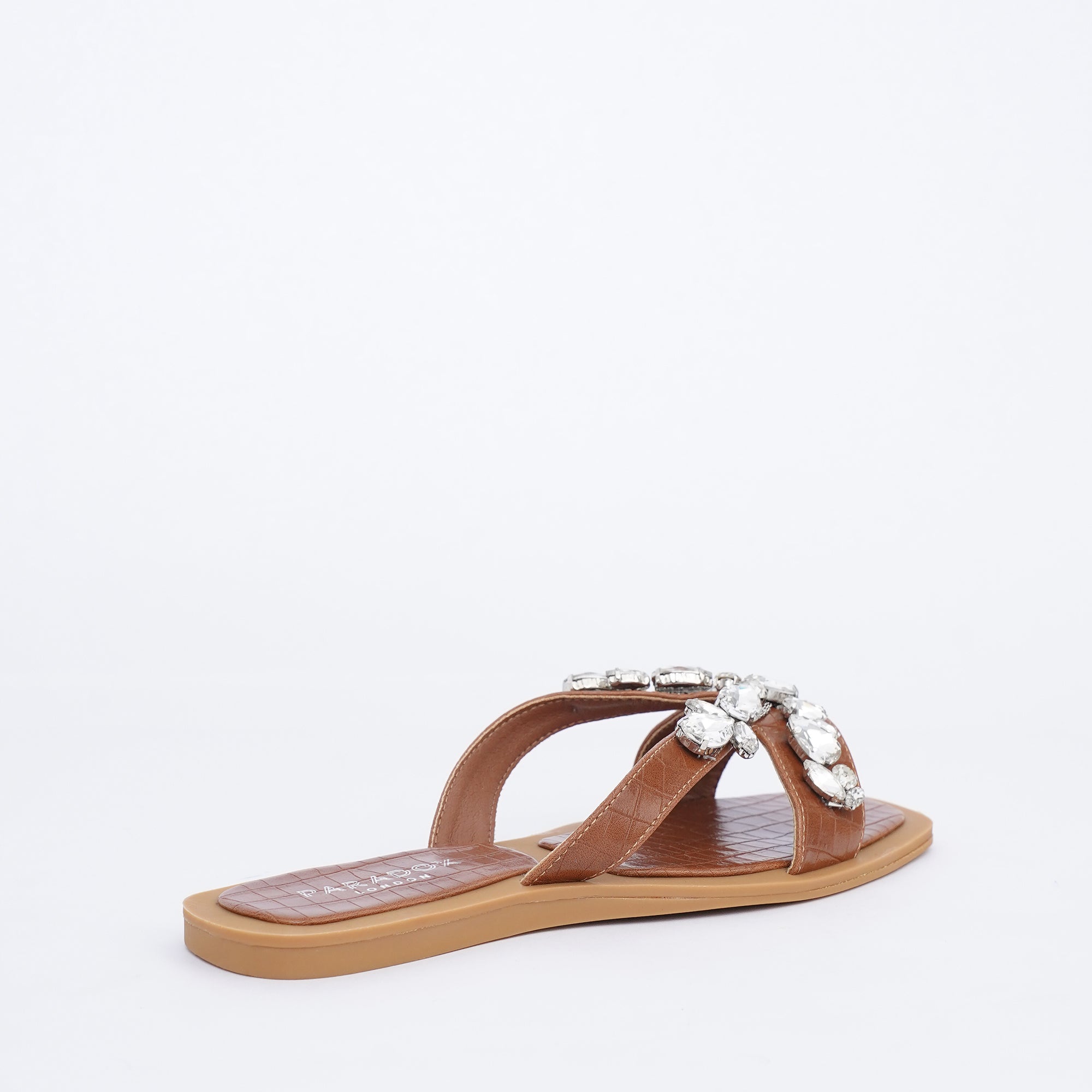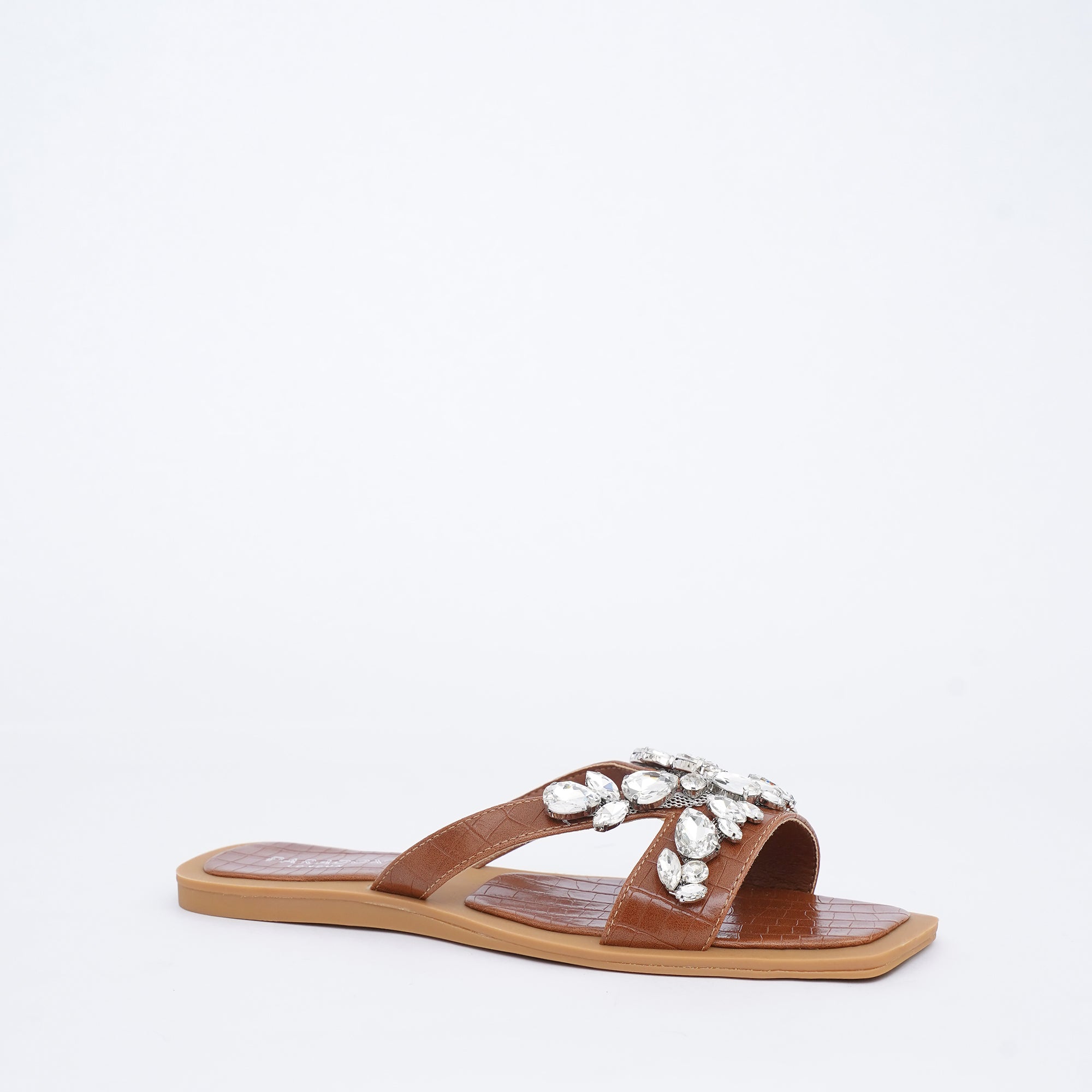 The Bellagio slide in brown delivers spectacular, intense glamour. It features a broad, knotted upper crafted in a rich Brown shade. The entire strap is dramatically encrusted with a dense field of gold-toned diamanté crystals, creating a complete, brilliant surface. This flat silhouette offers structured sparkle for any evening event.