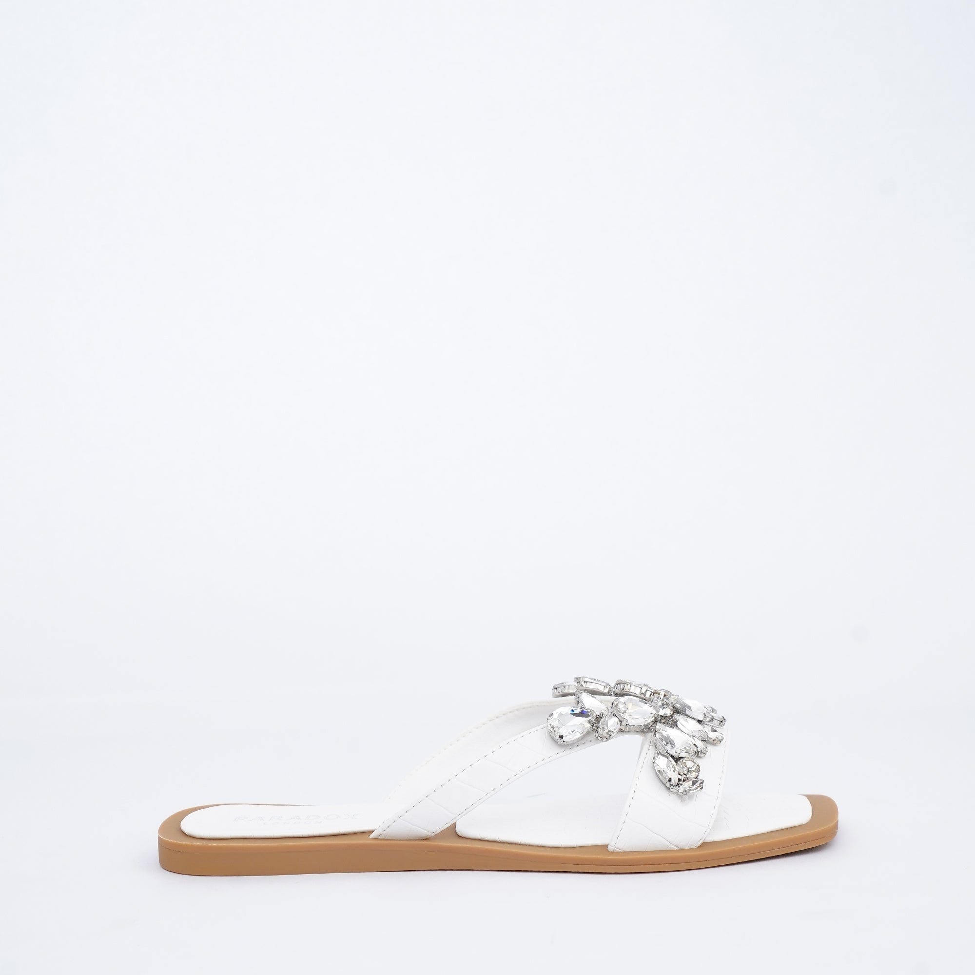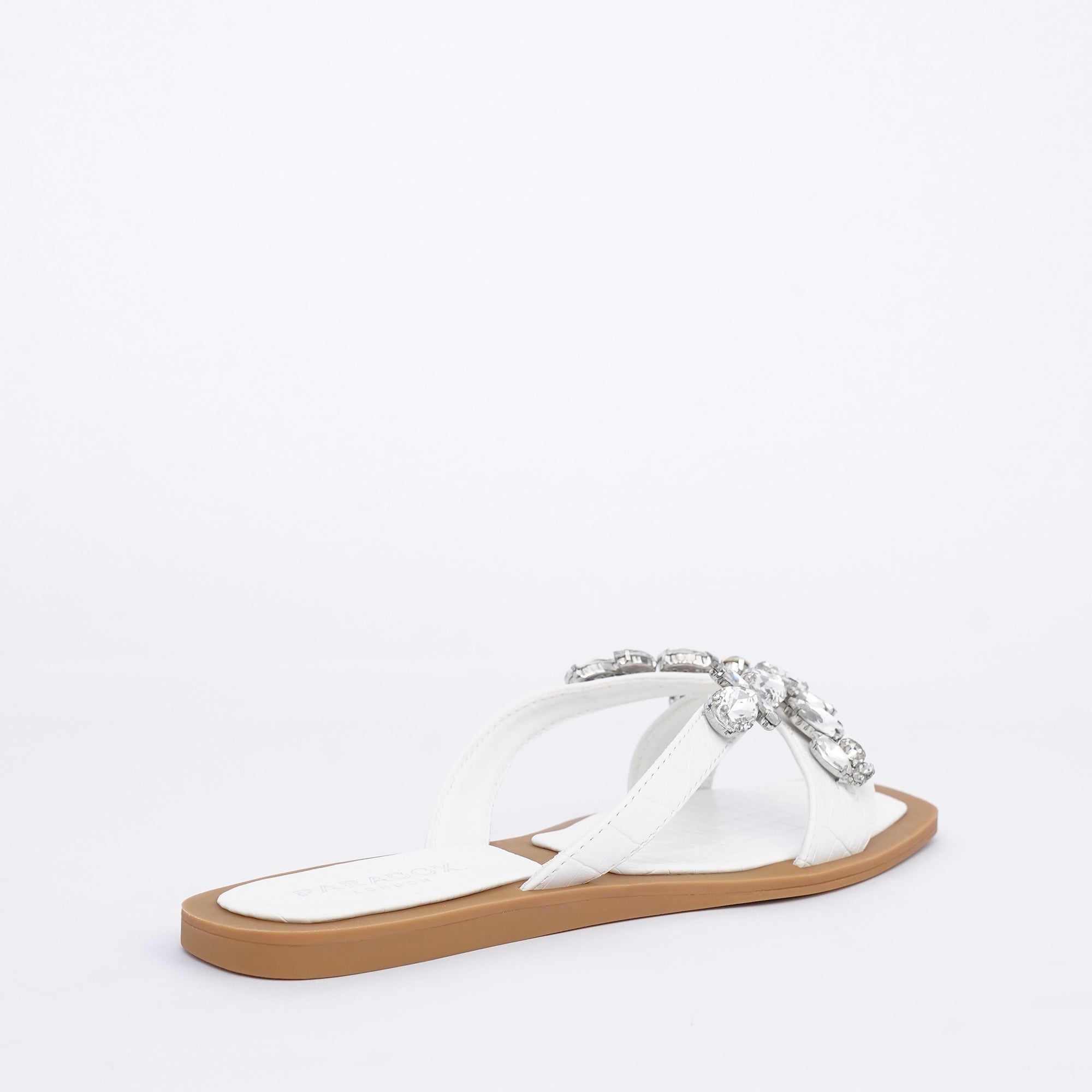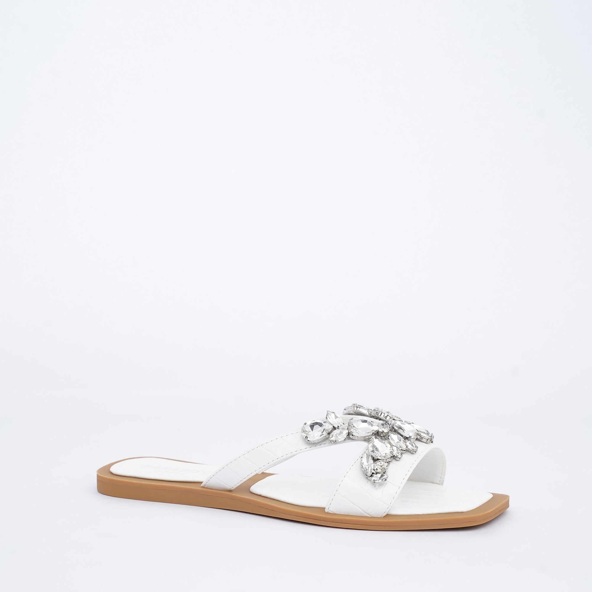 The Bellagio slide in white delivers spectacular, intense glamour. It features a broad, knotted upper crafted in a pristine White shade. The entire strap is dramatically encrusted with a dense field of silver toned diamanté crystals, creating a complete, brilliant surface. This flat silhouette offers structured sparkle for any evening event.