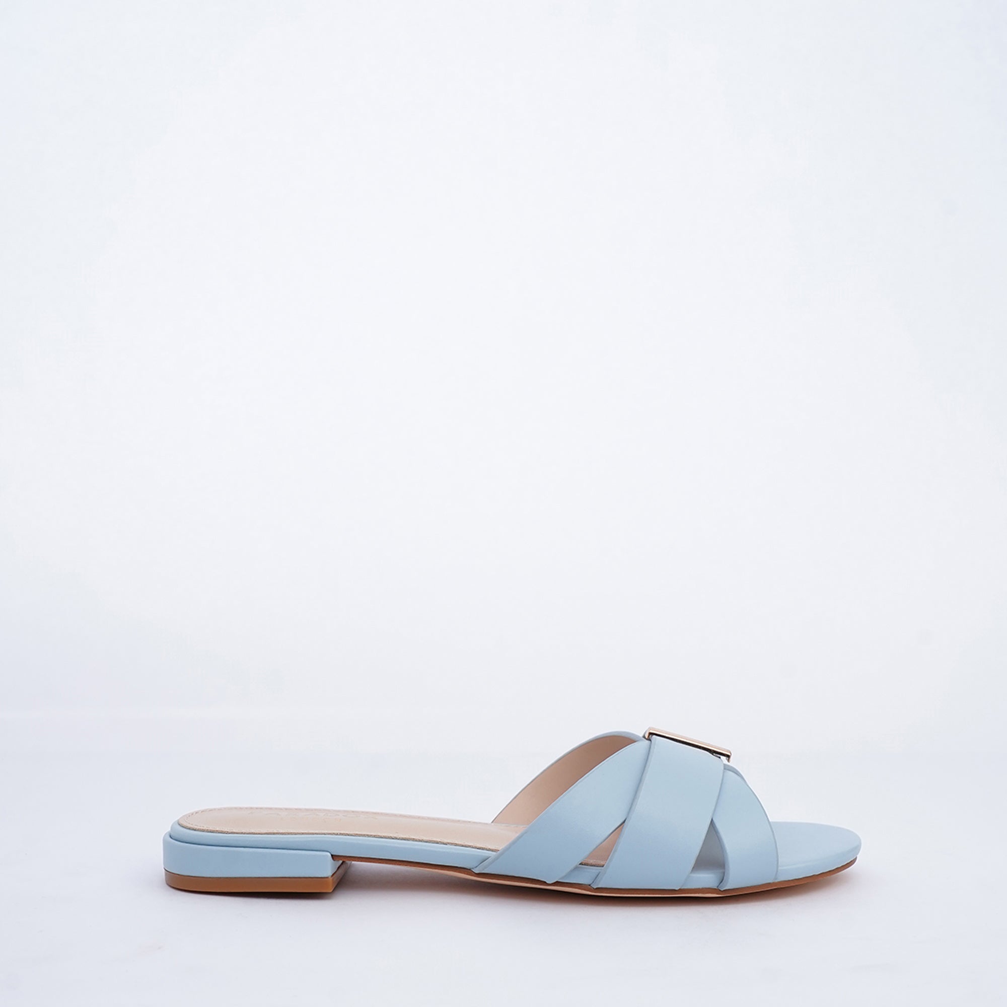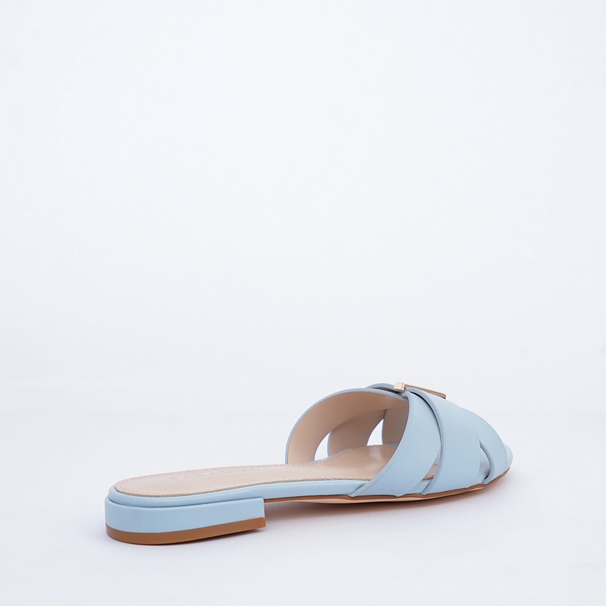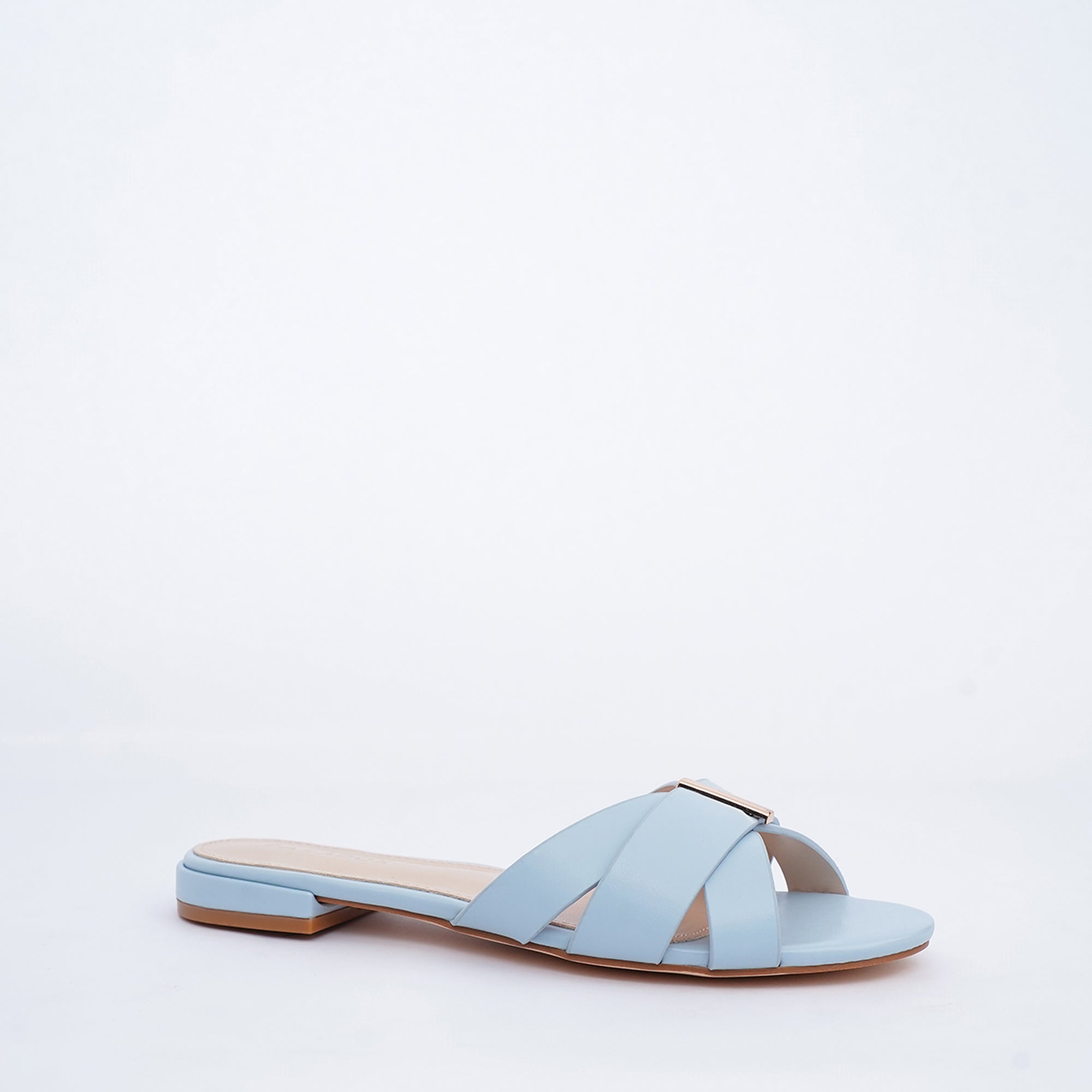 The Bluebell slide in blue delivers sleek, modern minimalism. It features a broad, smooth upper crafted entirely in the delicate Powder Blue PU shade. This distinctive silhouette is instantly elevated by a sleek central gold hardware detail, adding a refined, sophisticated finish to this comfortable flat.