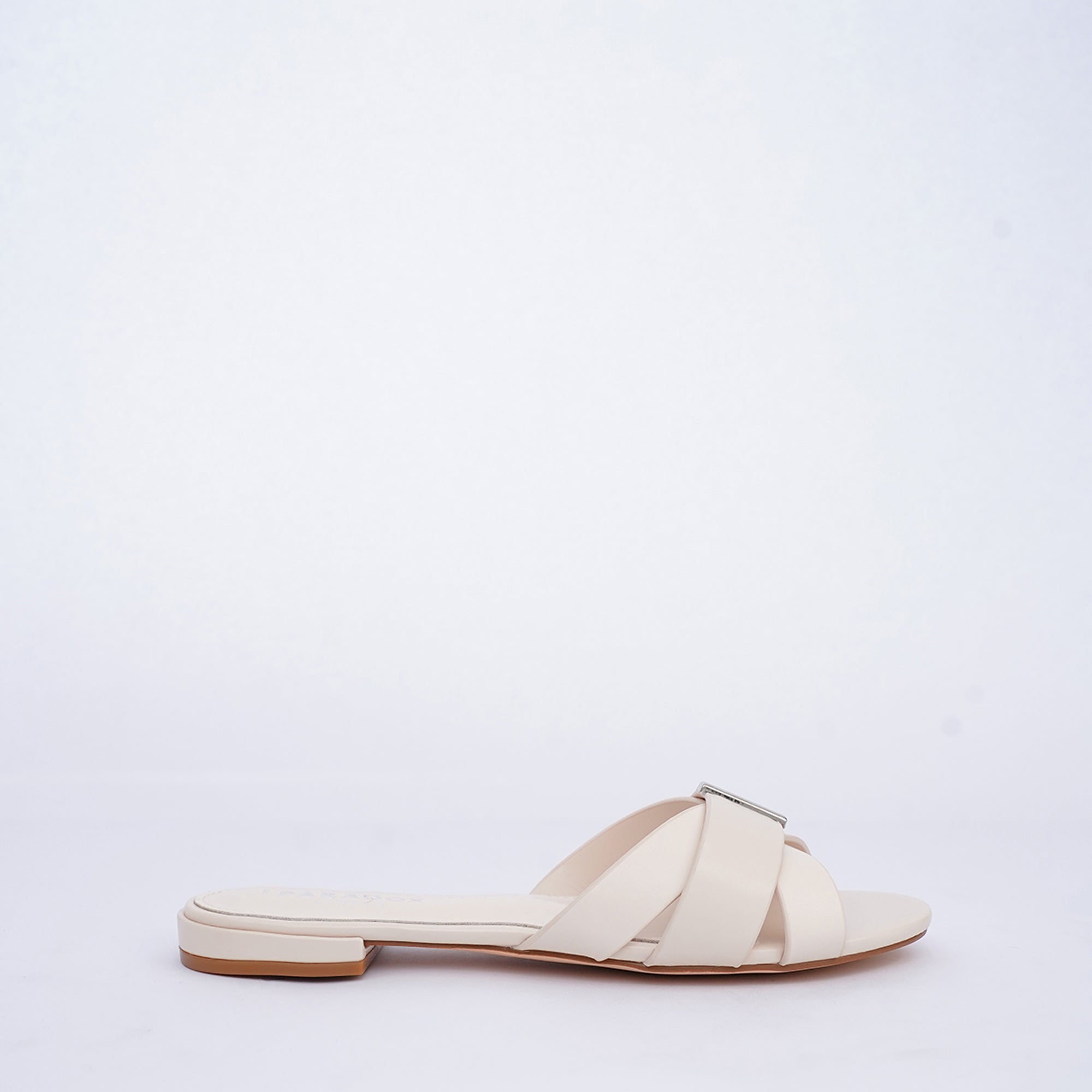 The Bluebell slide in white delivers sleek, modern minimalism. It features a broad, smooth upper crafted entirely in PU. This distinctive silhouette is instantly elevated by a sleek central gold hardware detail, adding a refined, sophisticated finish to this comfortable flat.