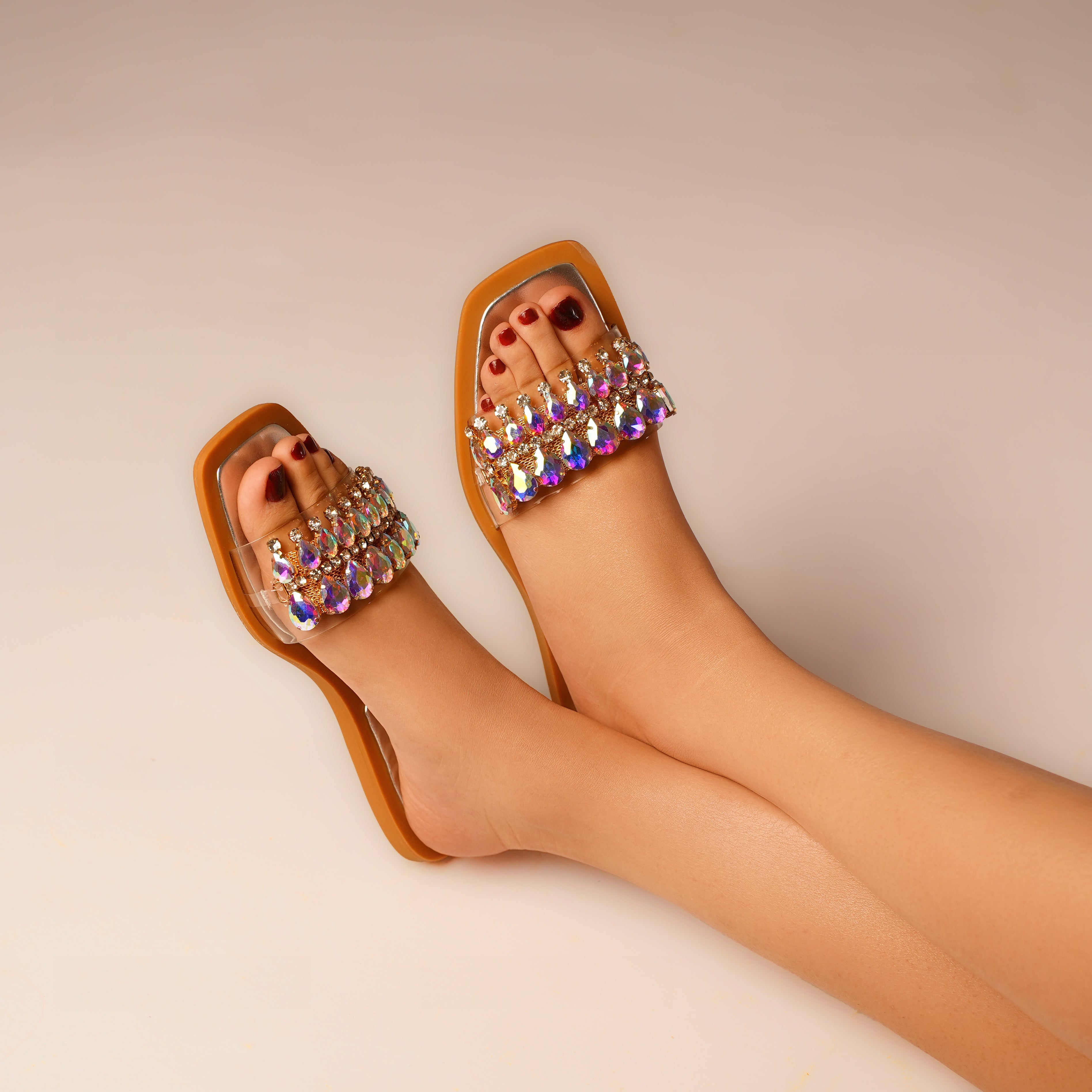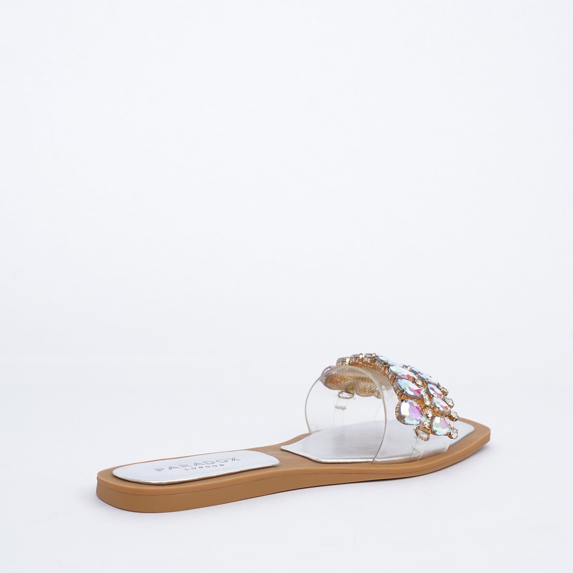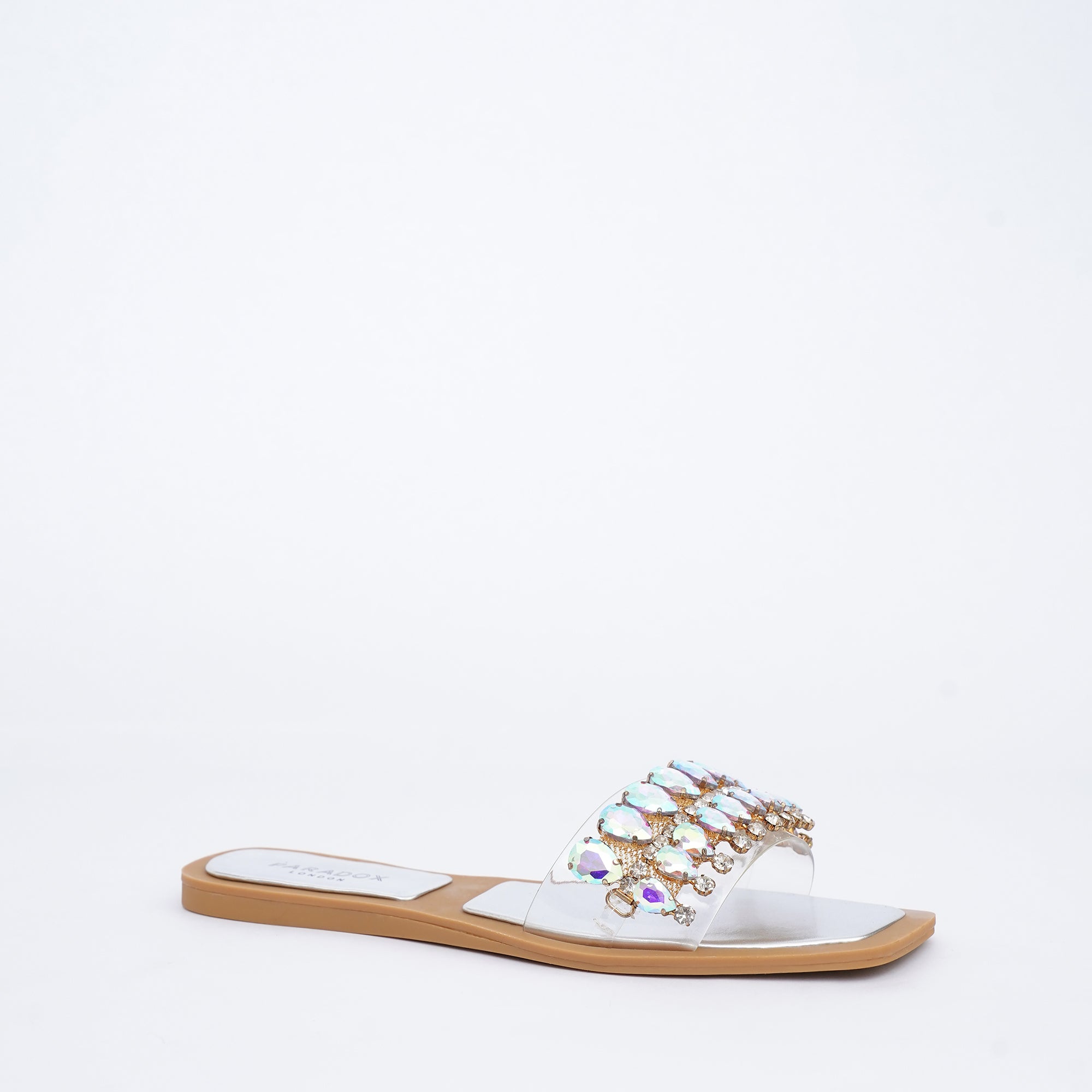 The Borealis slide in silver delivers spectacular, intense glamour. It features a broad, smooth upper crafted in a lustrous Silver shade. The entire strap is dramatically encrusted with a dense field of silver toned diamanté crystals, creating a complete, brilliant surface. This flat silhouette offers liquid silver sparkle for any evening event.