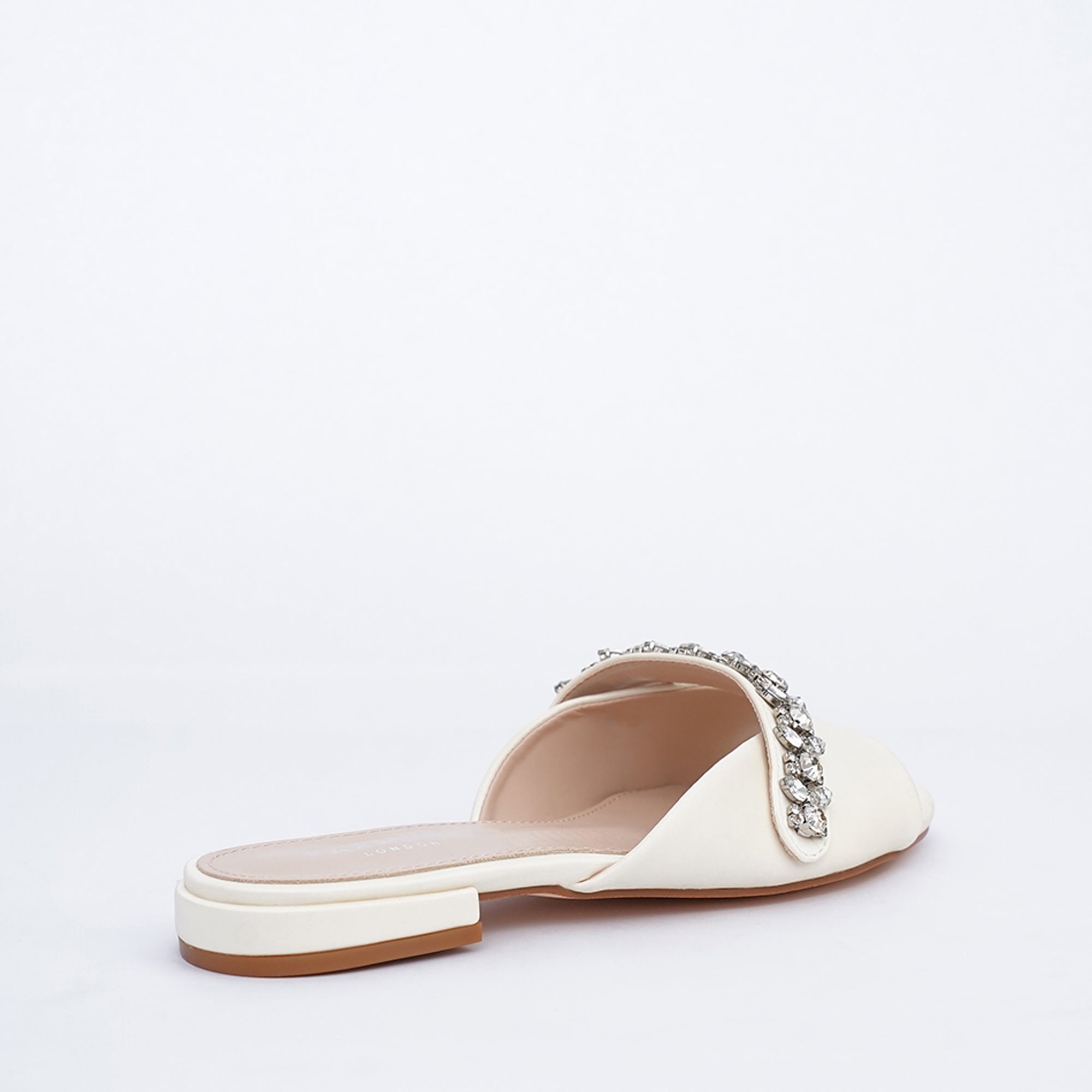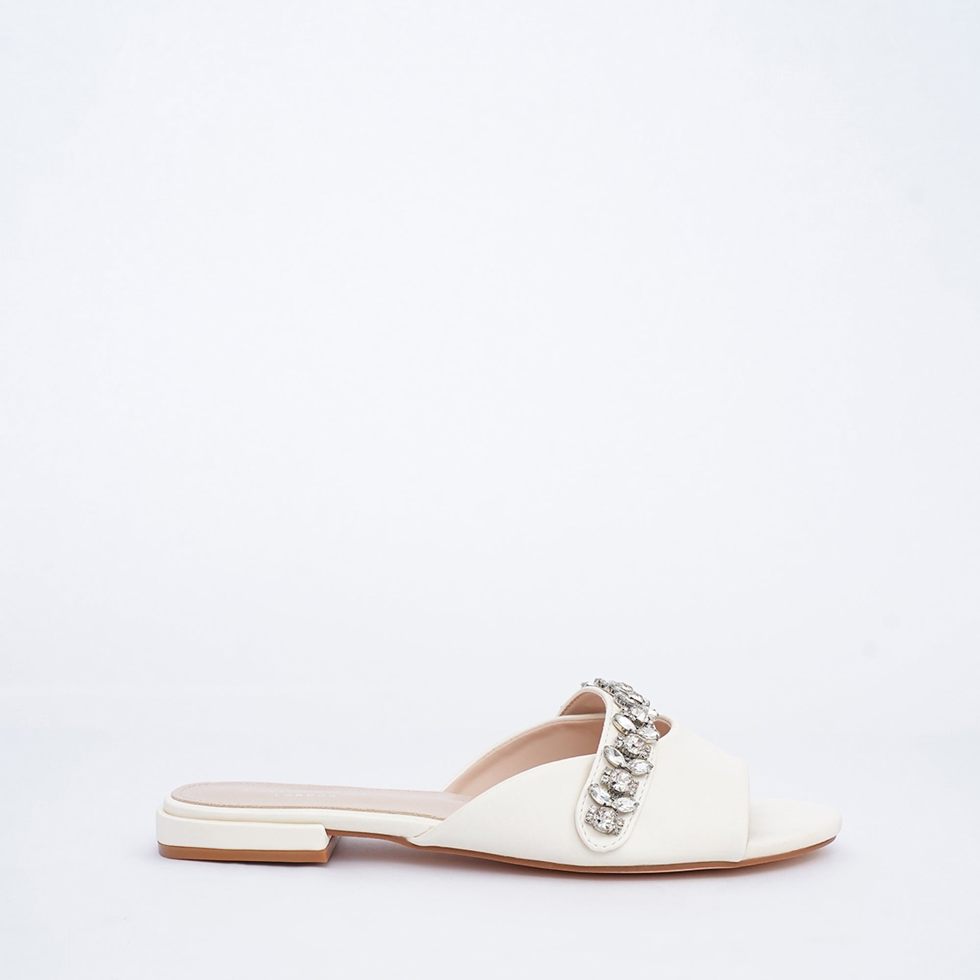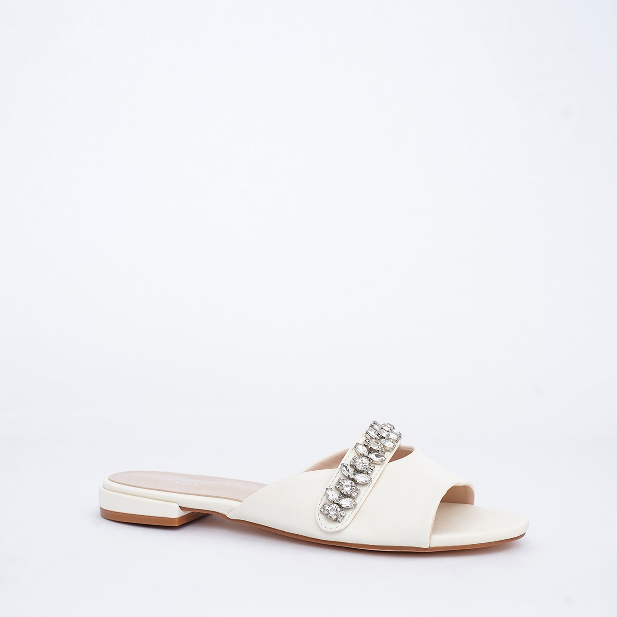 The Brinley slide offers luxurious slip on comfort. Its wide upper is crafted from smooth White PU, providing a pristine, clean body. The strap is dramatically lined with a dense border of brilliant silver toned diamanté crystals, creating a high wattage sparkle that contrasts sharply with the pure white tone.