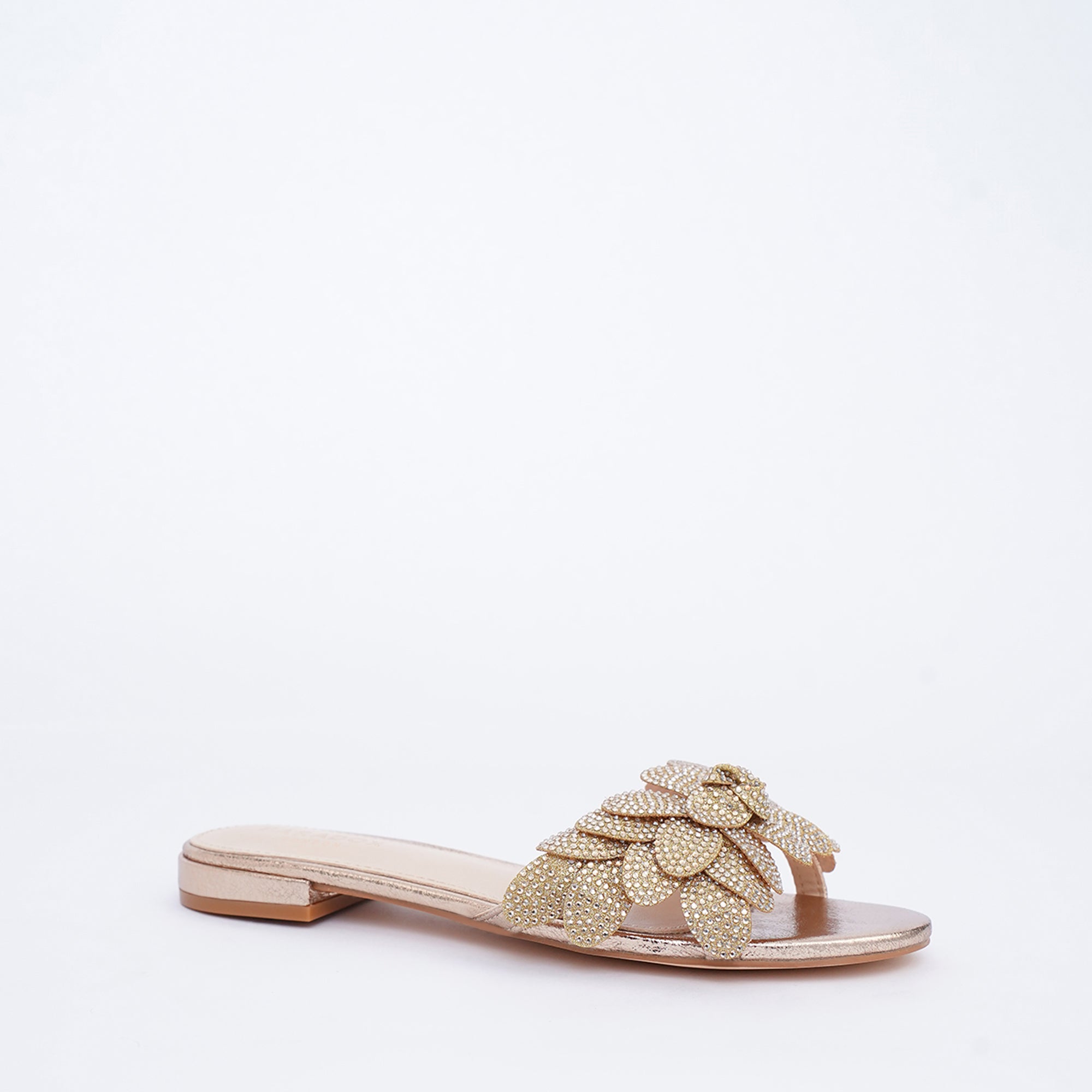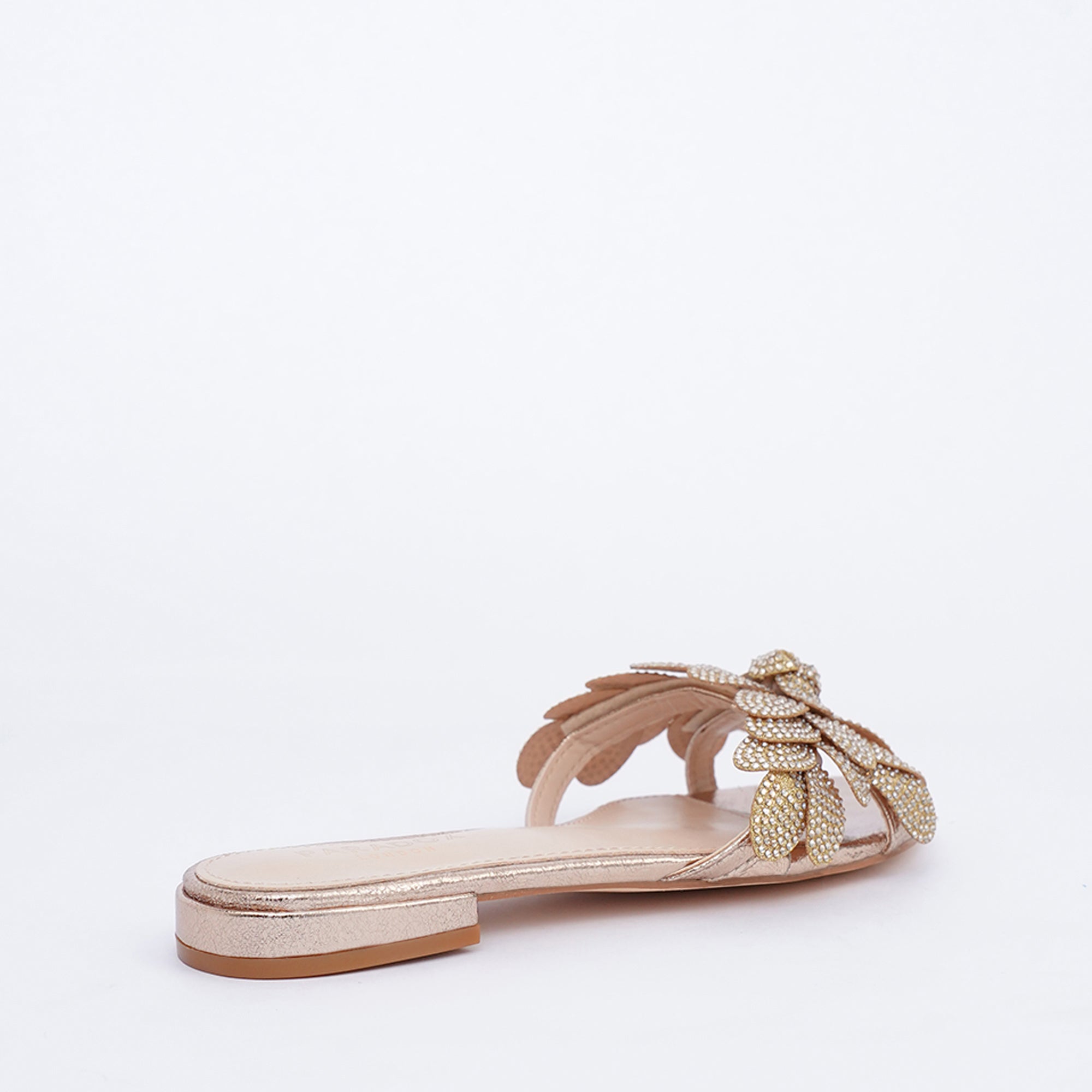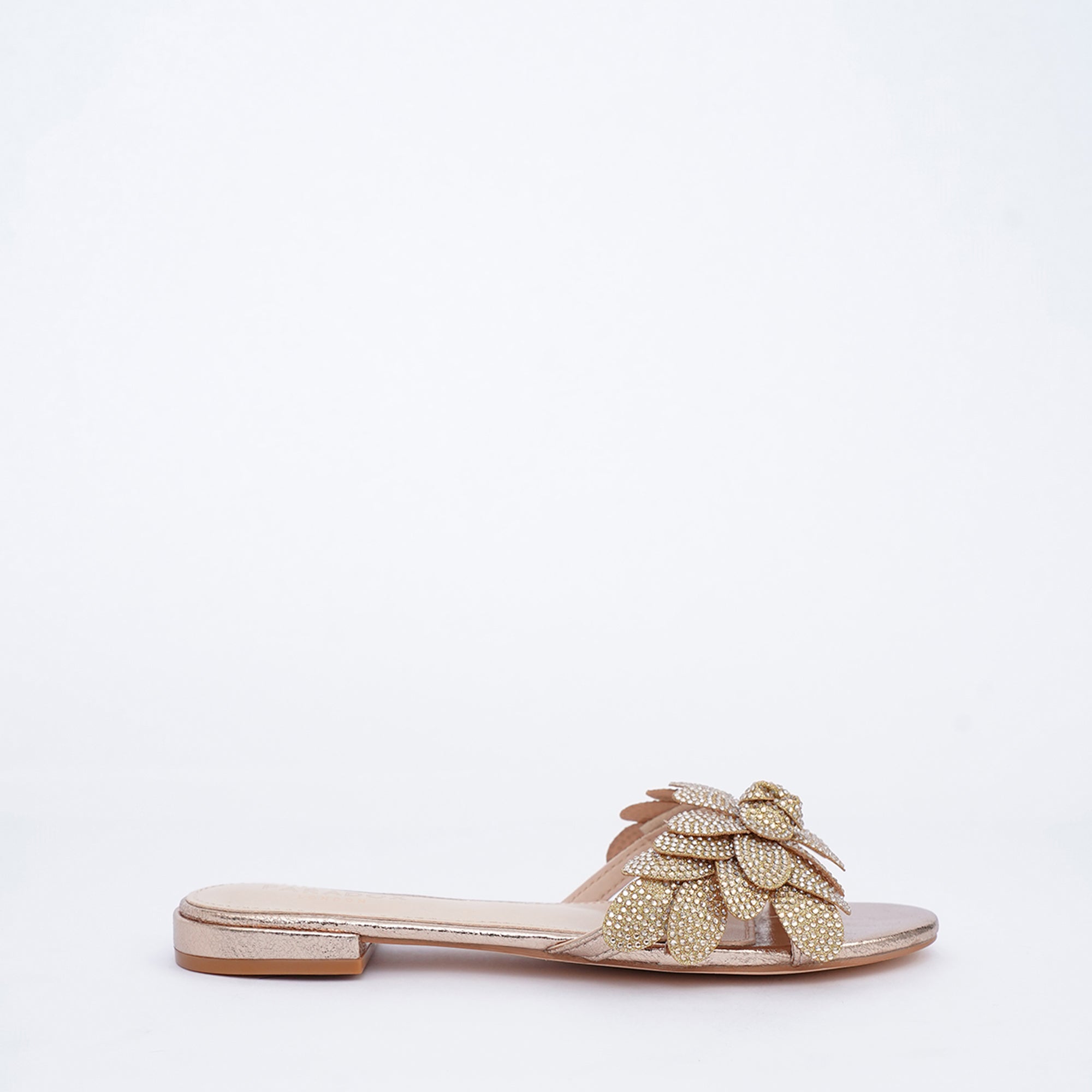 The Buttercup slide delivers statement glamour. It features a unique, 3D floral cluster upper crafted in a rich Champagne base. The entire structure is covered in a dense layer of gold toned diamanté crystals, creating a dimensional sparkle.