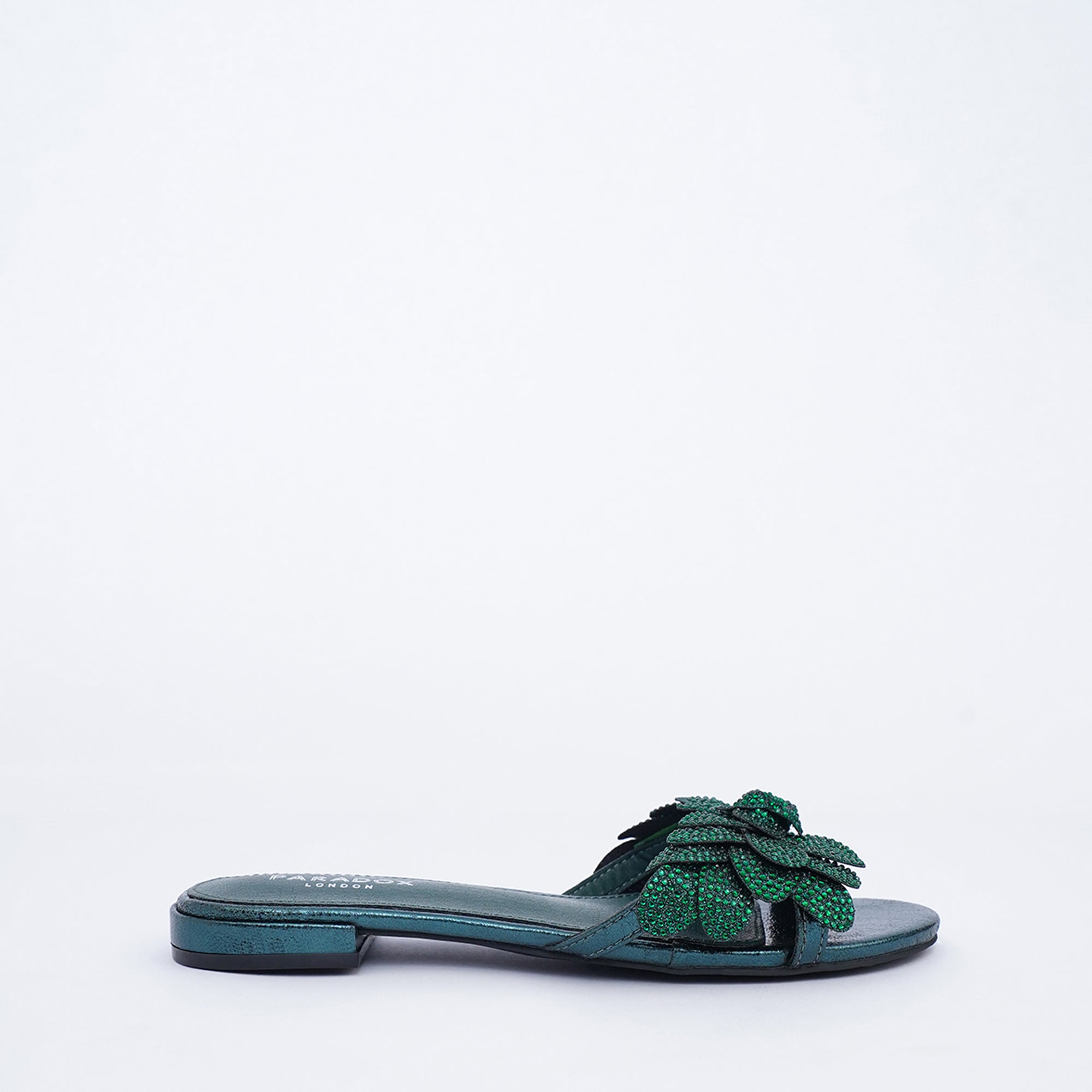 The Buttercup slide delivers exceptional, textural glamour and refined comfort. It features a unique, 3D floral cluster upper crafted in a rich Dark Green base. The entire structure is dramatically covered in a dense layer of dark green toned diamanté crystals, creating dimensional sparkle. This statement flat silhouette elevates any evening look with its luxurious monochromatic shine.