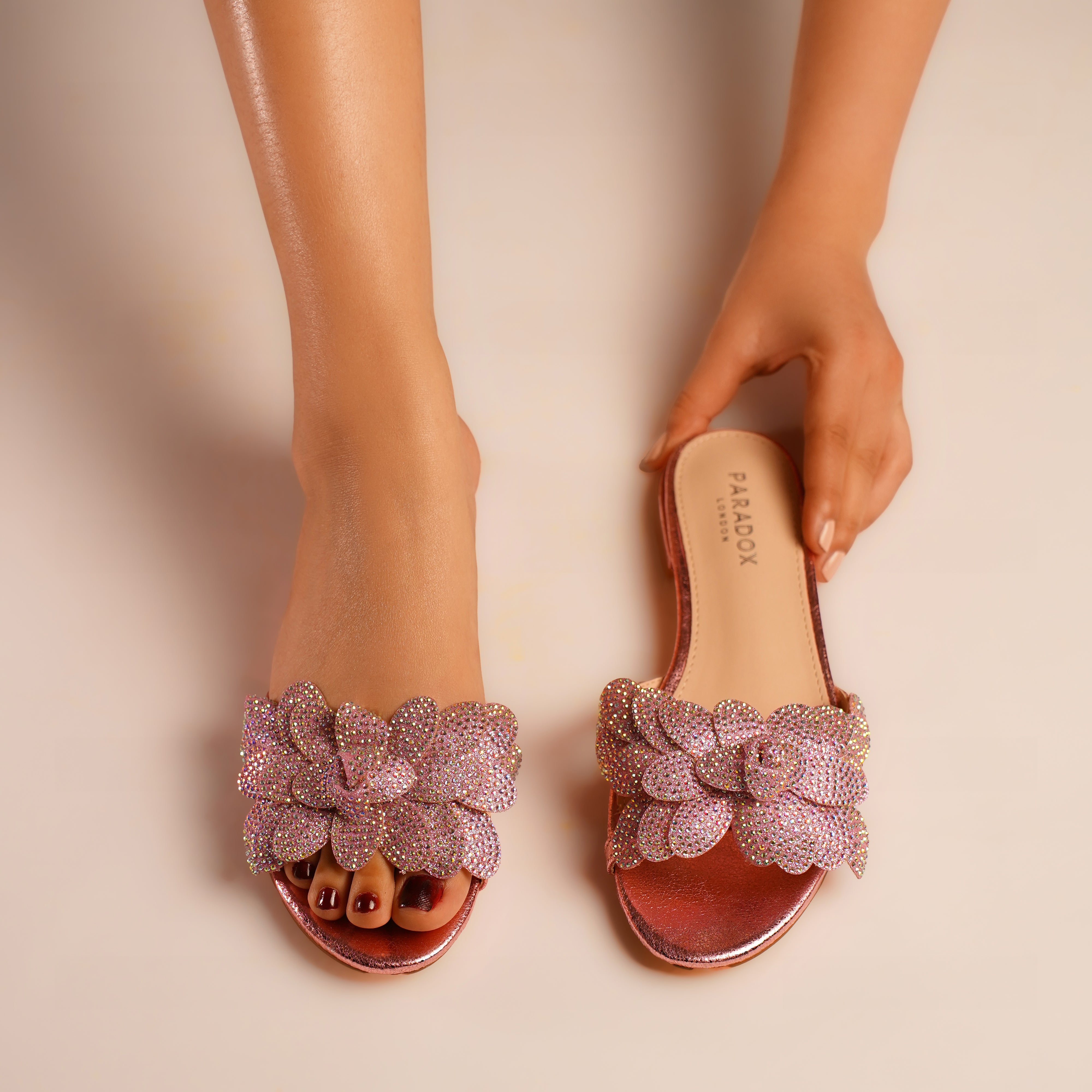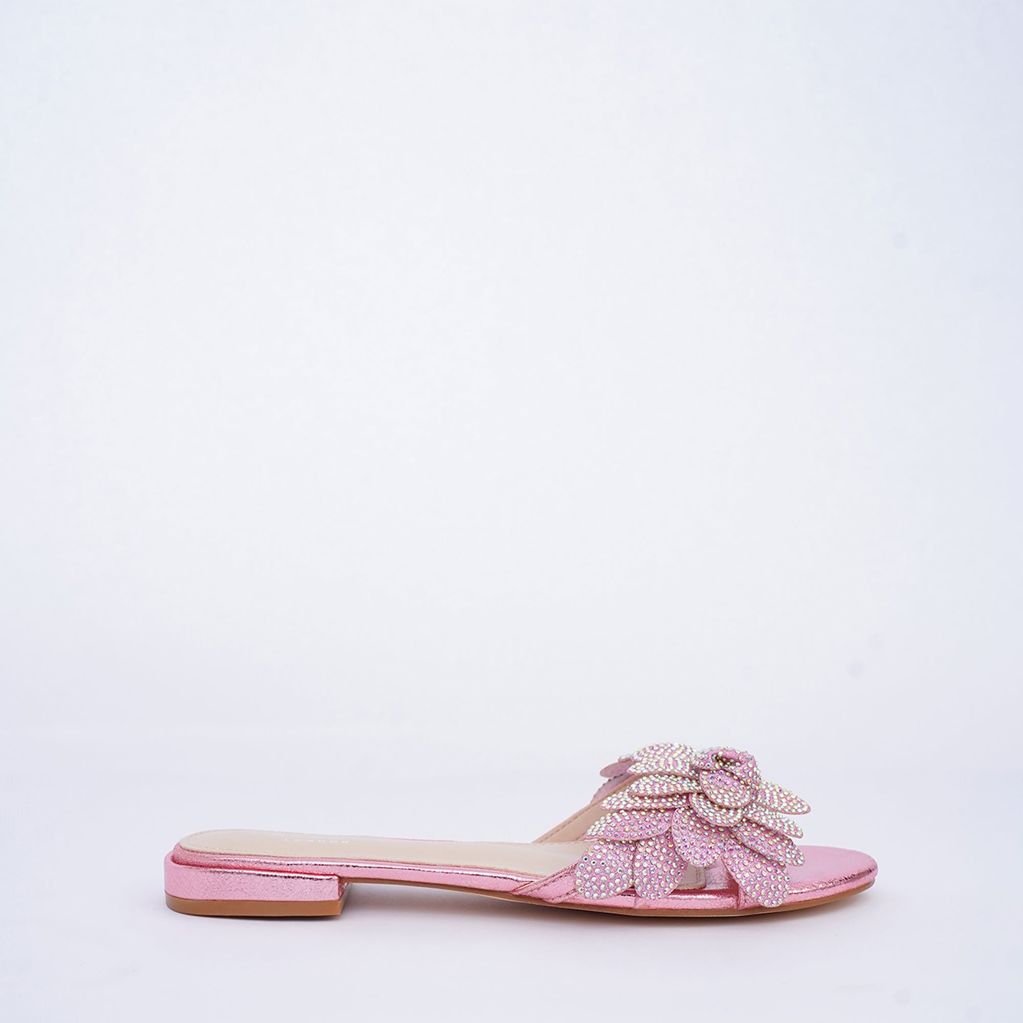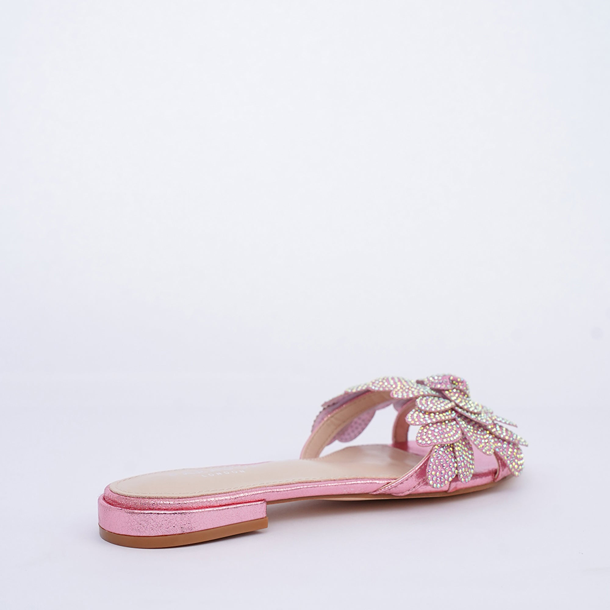 The Buttercup slide delivers statement glamour. It features a unique, 3D floral cluster upper crafted in an Iridescent Multi color base. The entire structure is covered in a dense layer of light refracting diamanté crystals, creating a dimensional, high wattage sparkle.