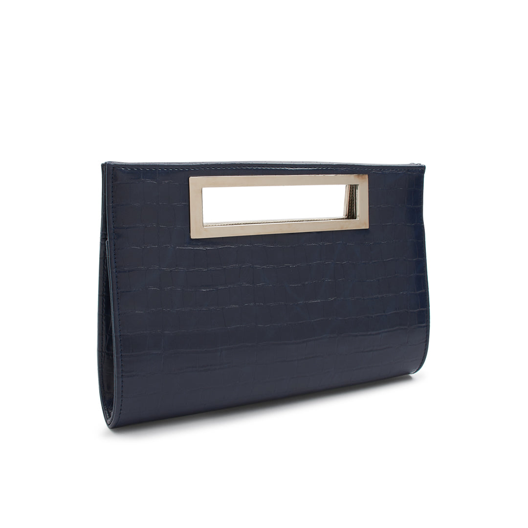 The 'Delma' clutch bag features a metal handle and button closure. A chain strap is included to transform this into a crossbody bag. The perfect size for all the essentials.