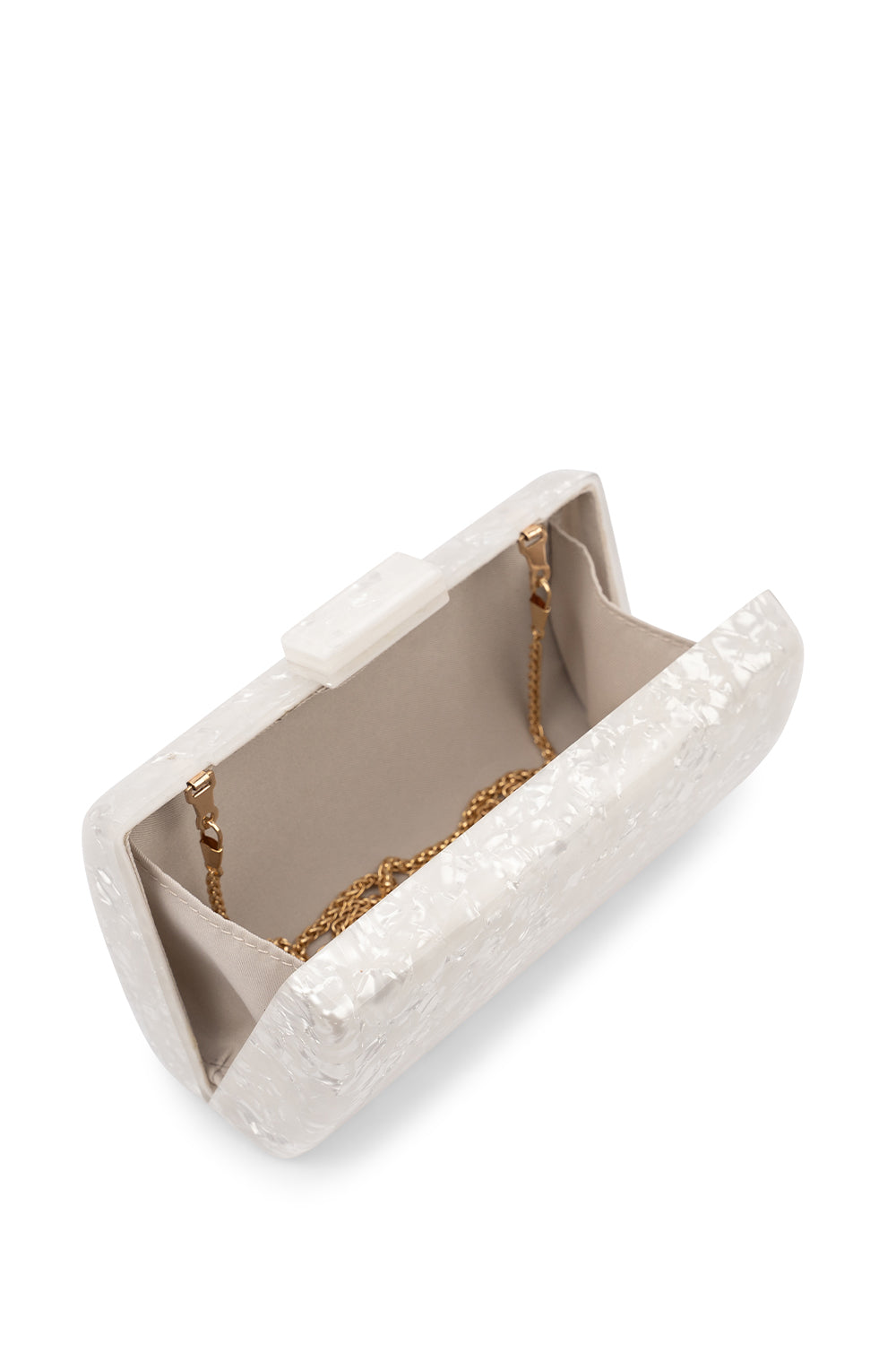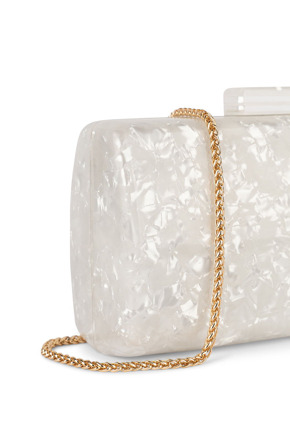 The Dreamer box clutch by Paradox London is a stunning pearlised marble effect acryllic. The perfect handbag for any party or special event.