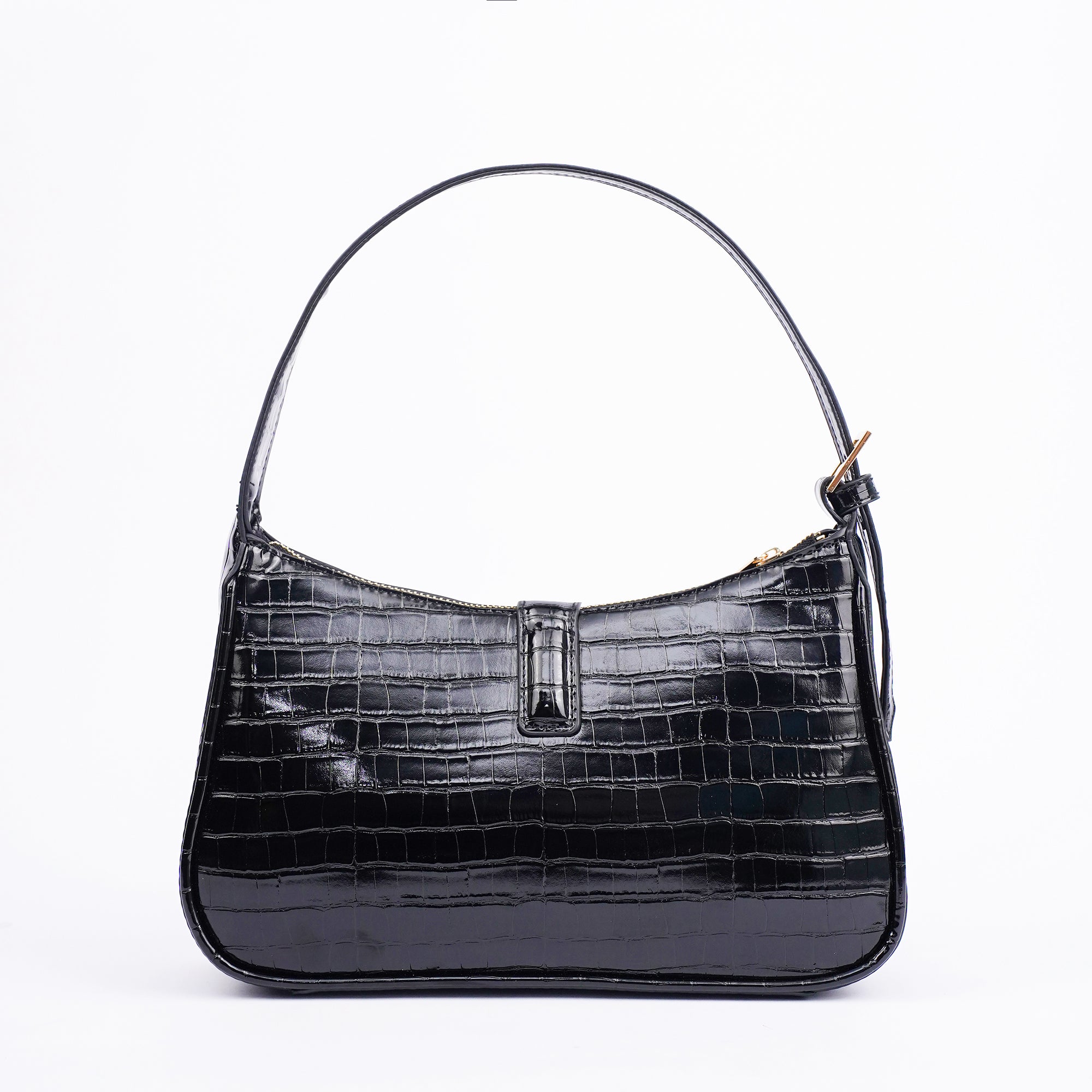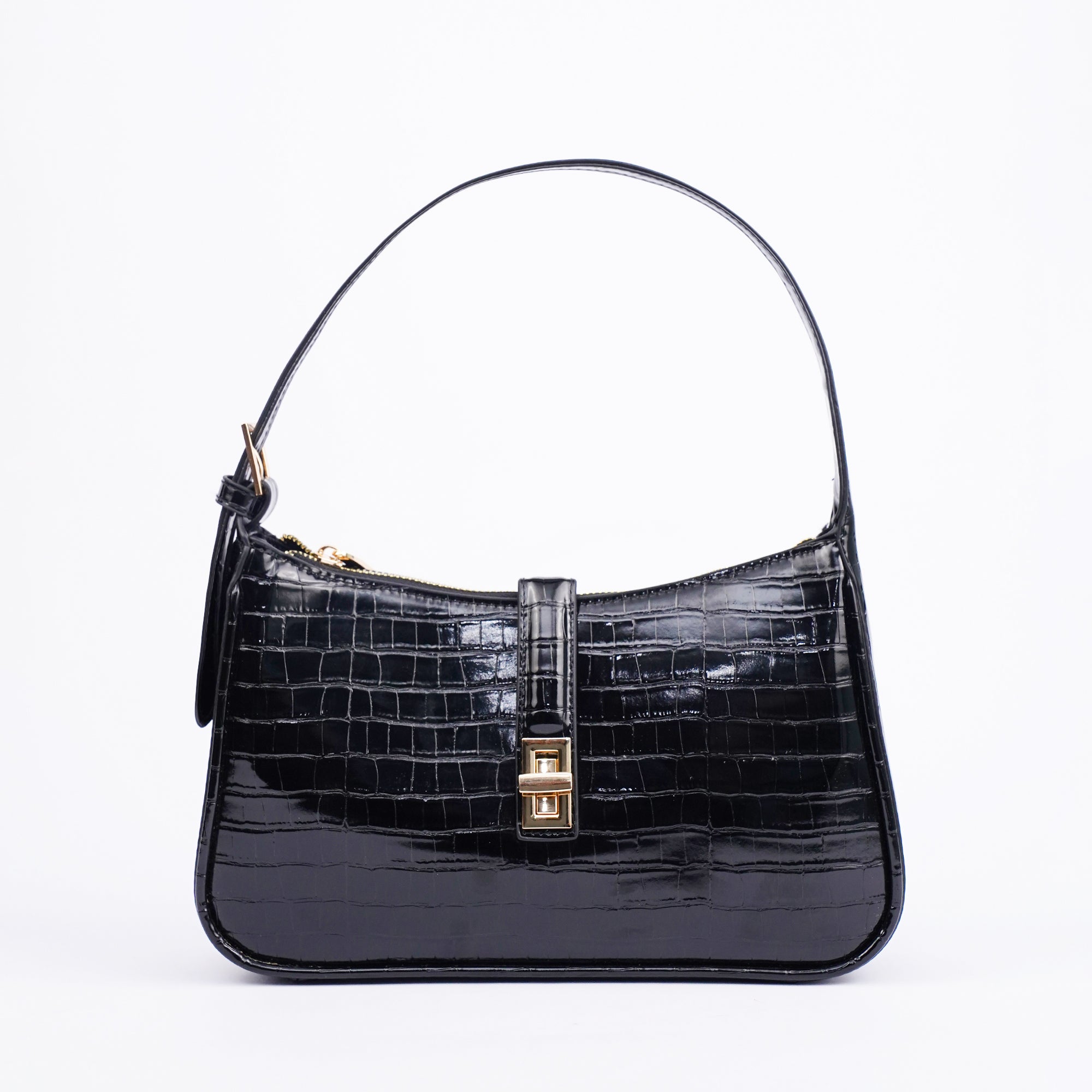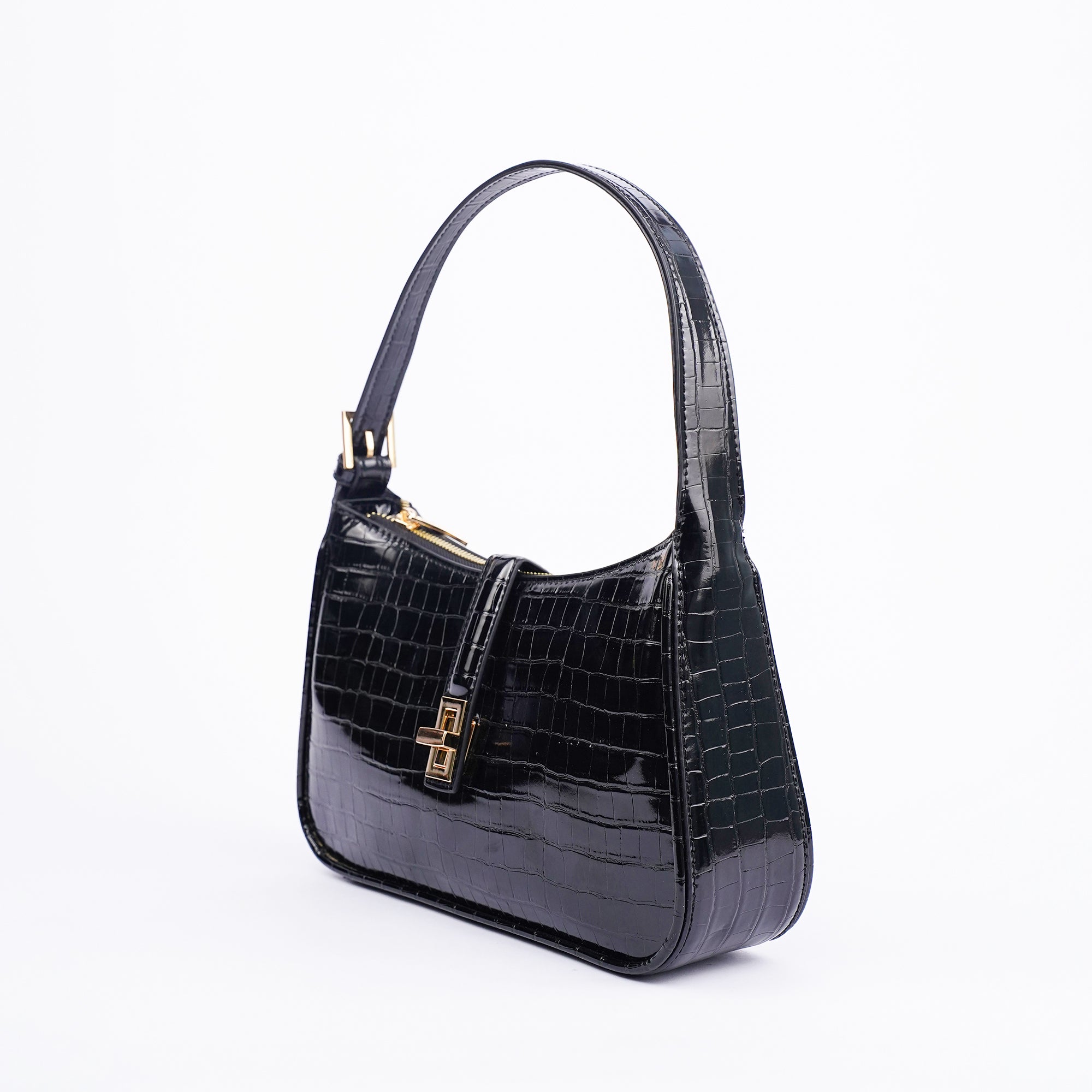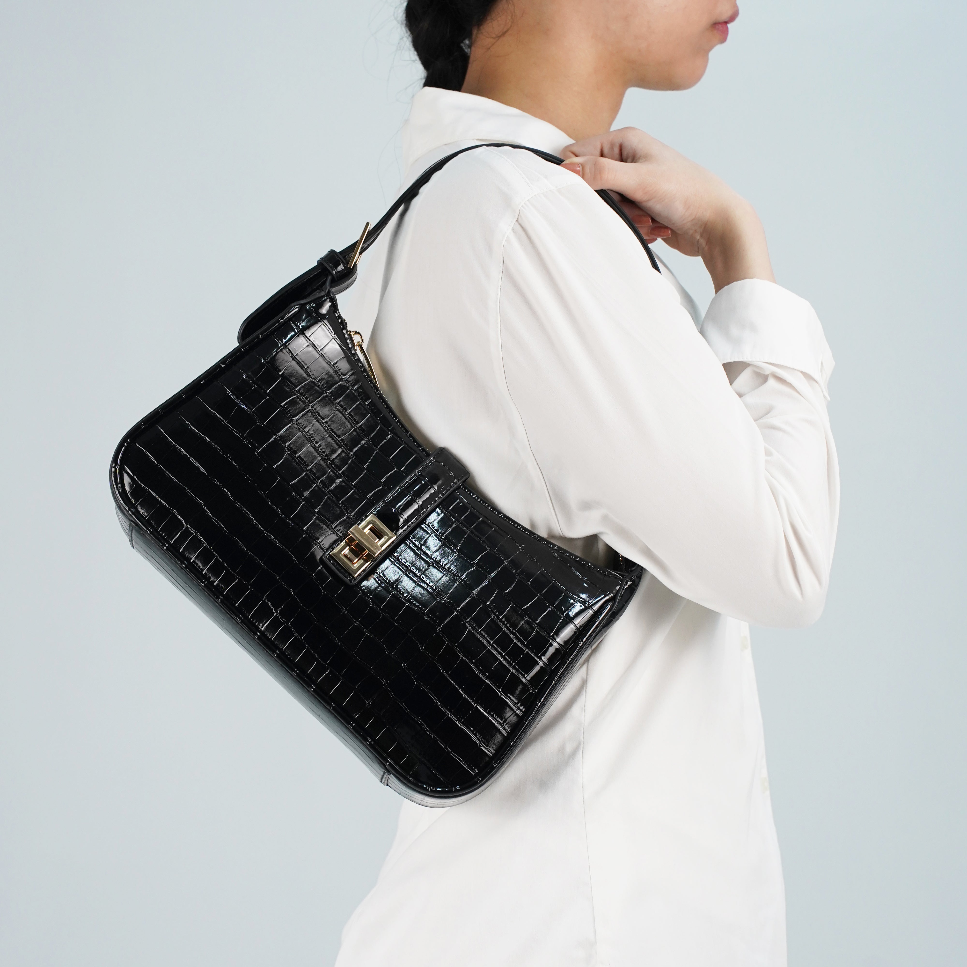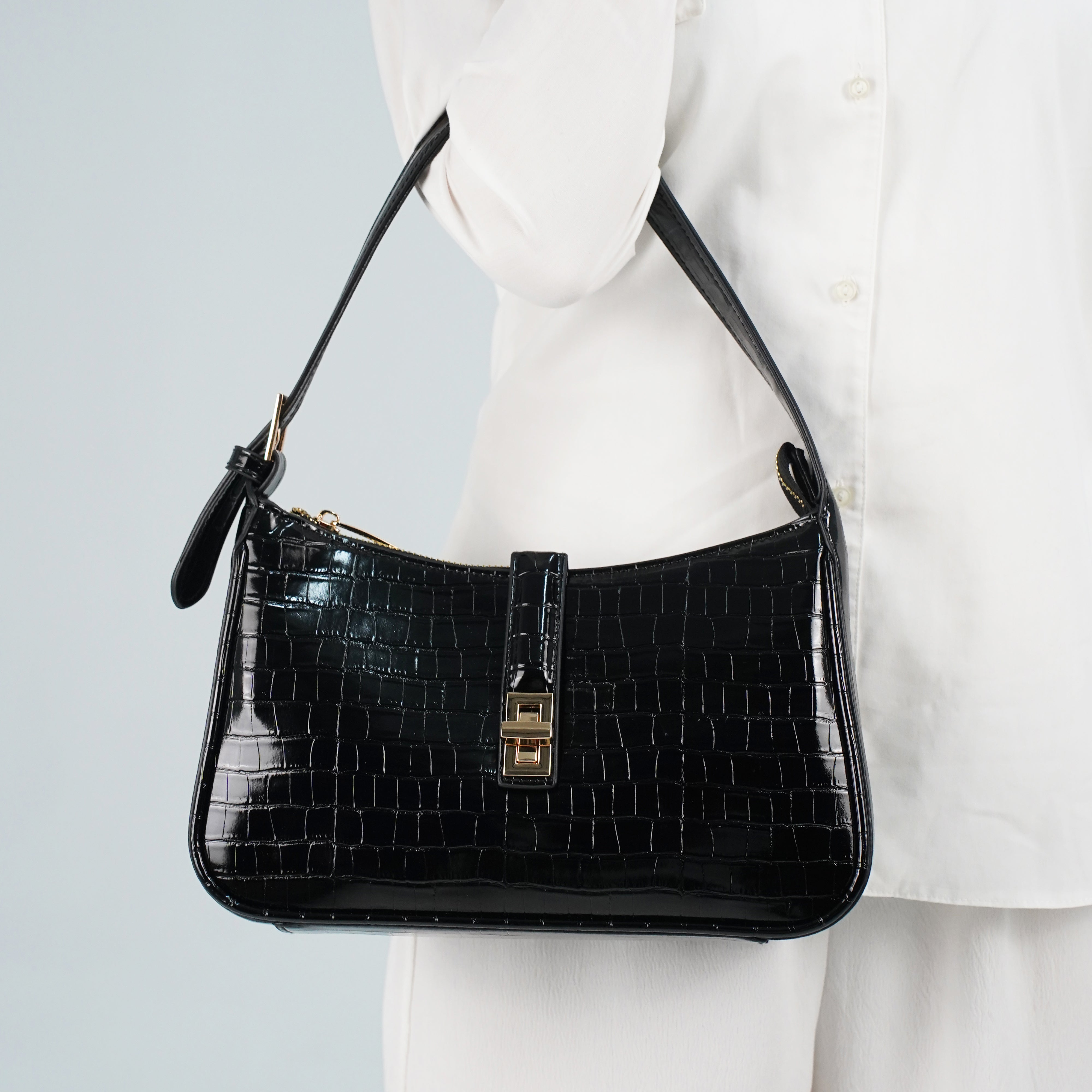 The Orabella shoulder bag in black combines classic elegance with a modern edge. Crafted in a high shine croc effect finish and featuring a structured rectangular silhouette with a gold tone clasp, its compact yet practical design makes it the perfect go to for both polished daytime looks and chic evening style.