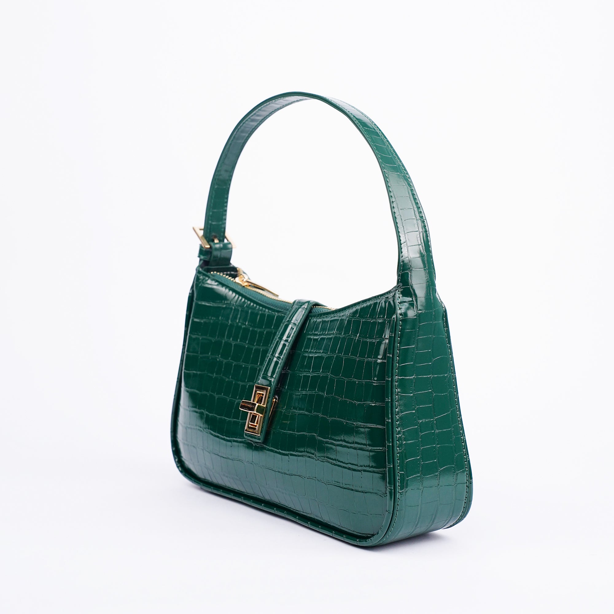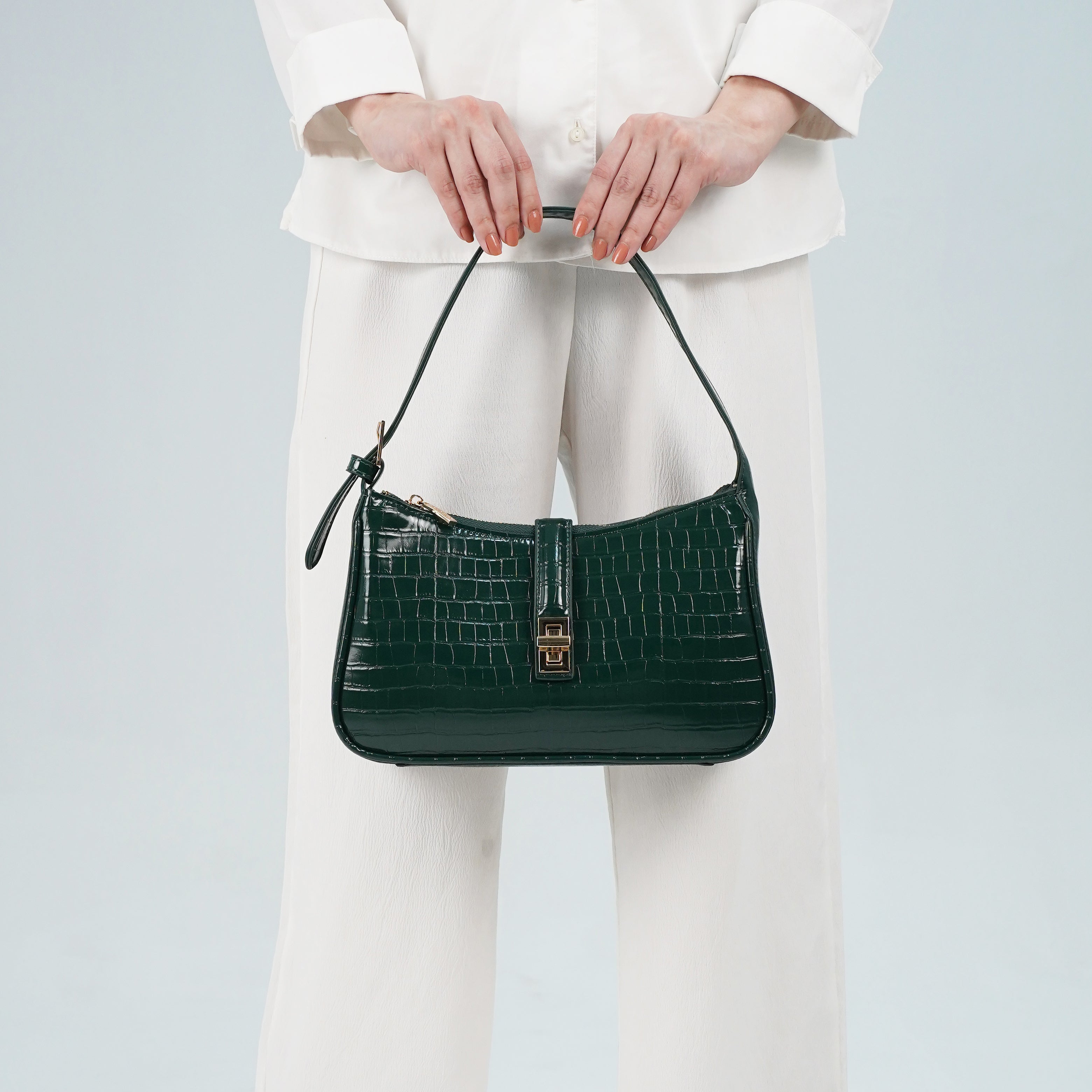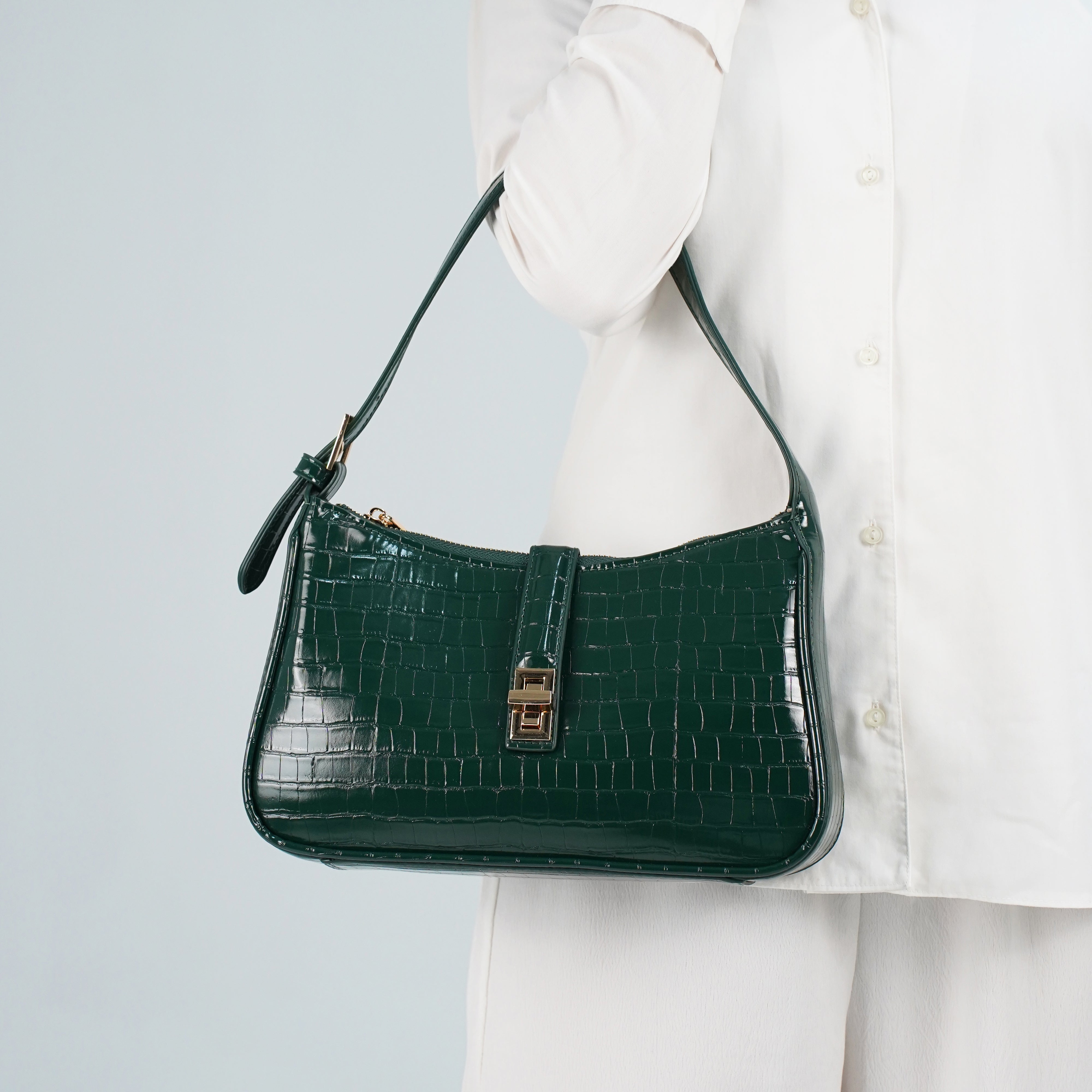 The Orabella shoulder bag in green combines classic elegance with a modern edge. Crafted in a high shine croc effect finish and featuring a structured rectangular silhouette with a gold tone clasp, its compact yet practical design makes it the perfect go to for both polished daytime looks and chic evening style.