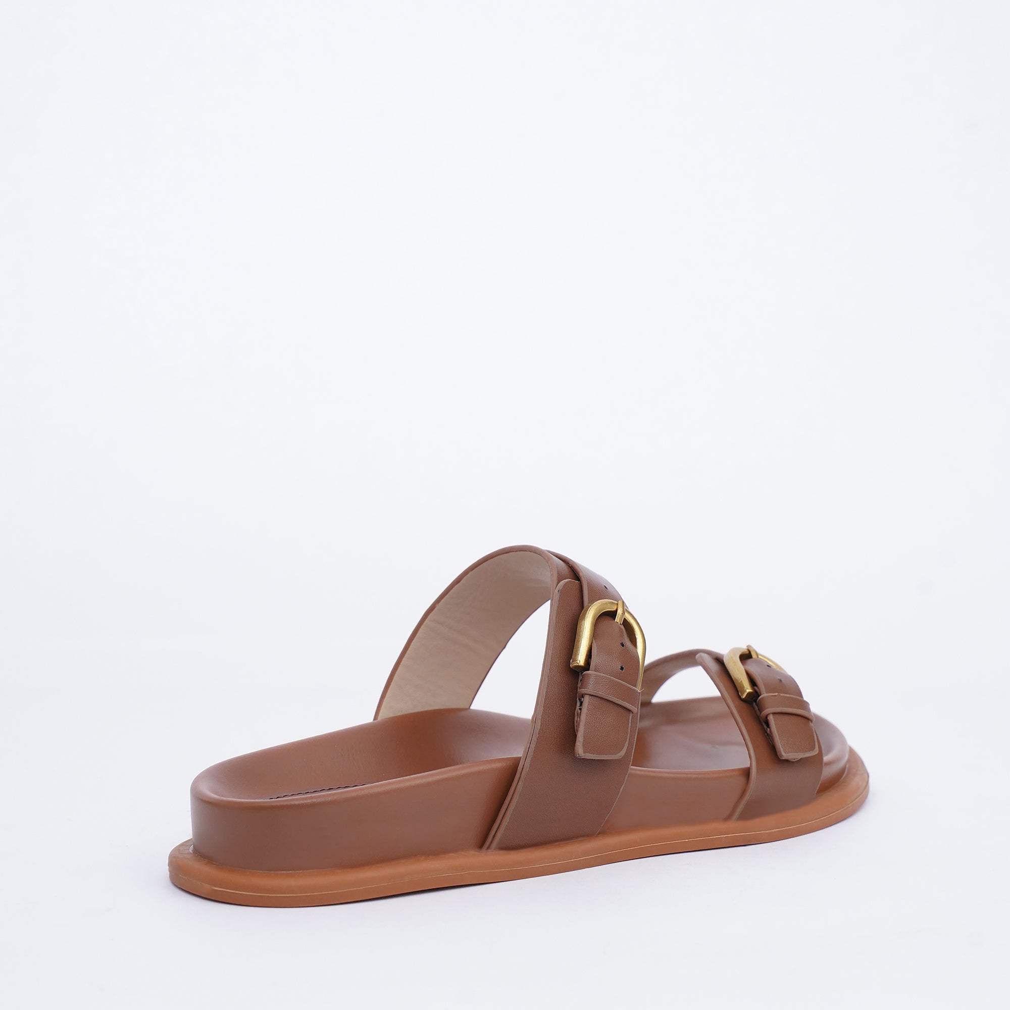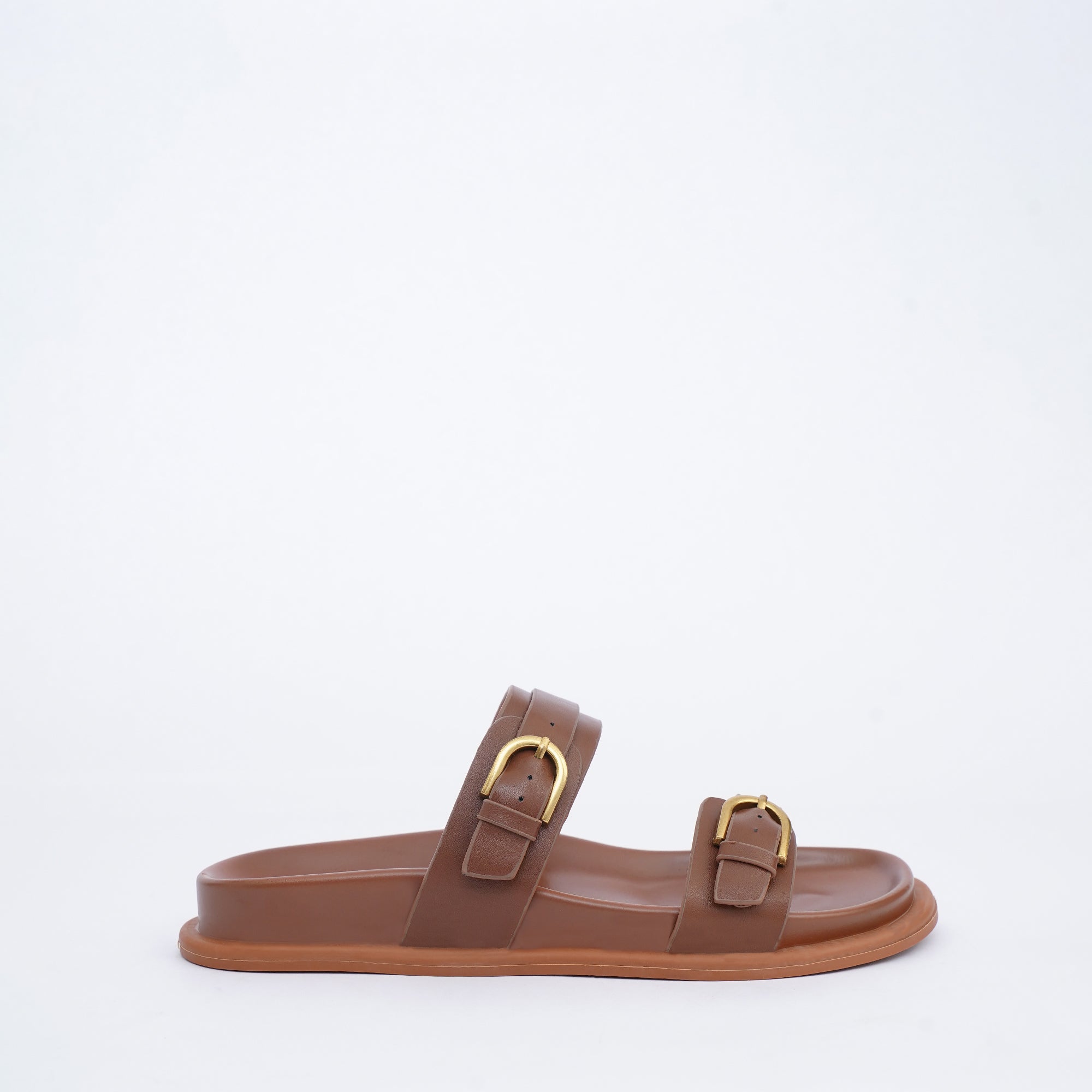 The Viera slide in dark brown delivers a chic style. It features two wide, textured straps meticulously crafted in a rich Dark Brown PU shade. The silhouette is defined by chunky, statement hardware buckles, adding a bold, modern edge to this comfortable flat.